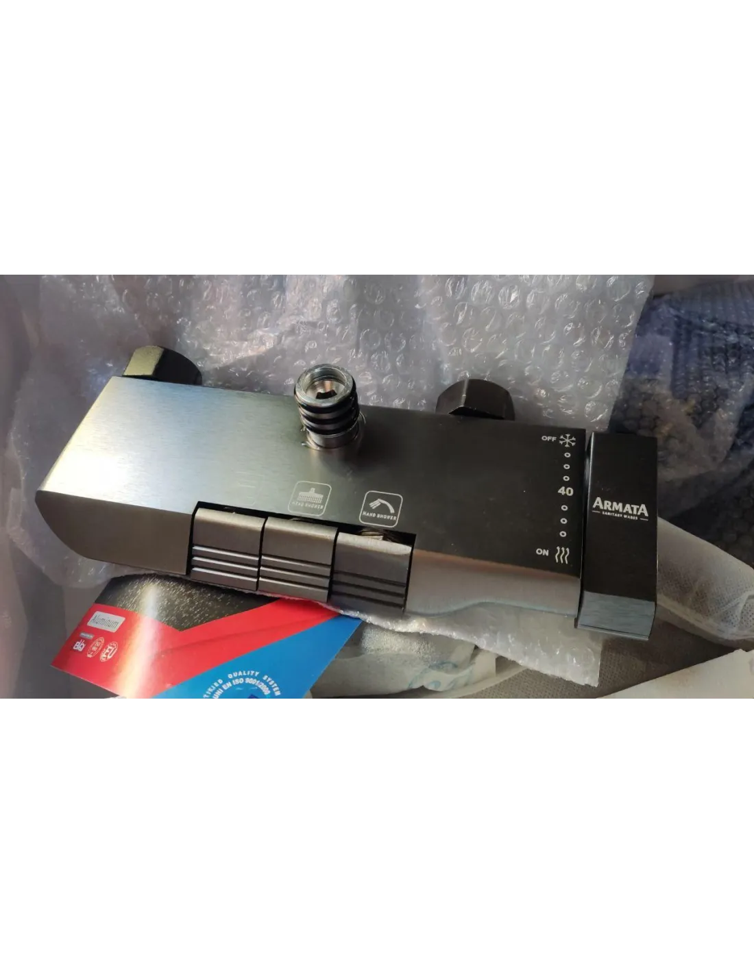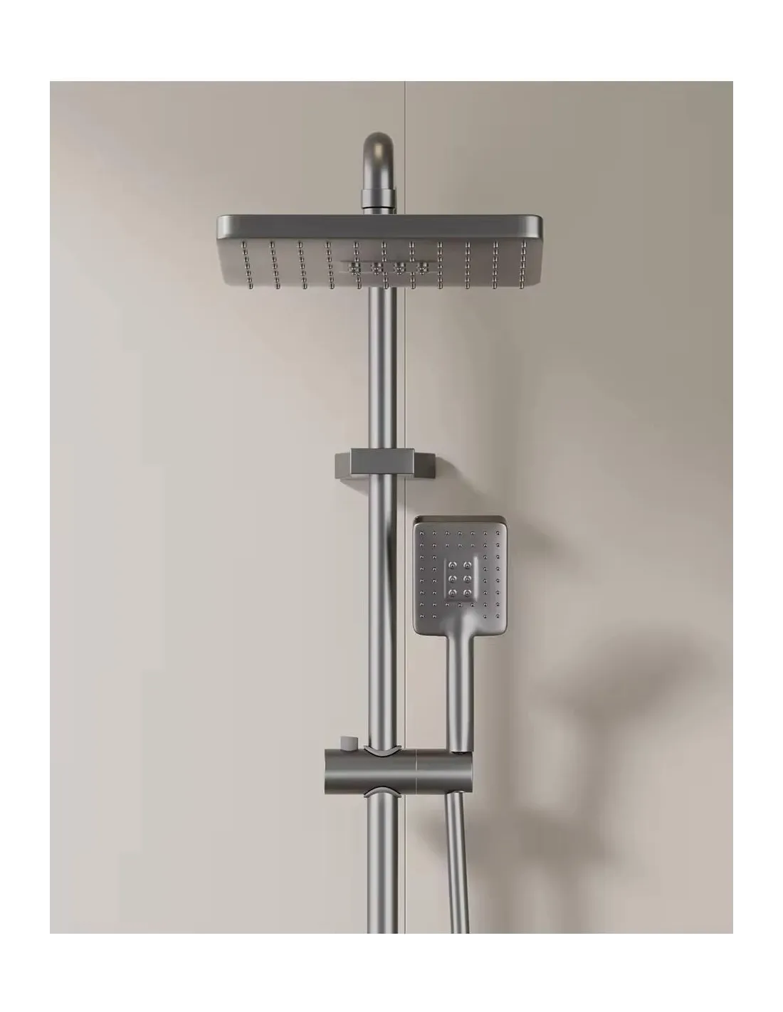 В душевой системе Armata BCF-009-J Graphite все функциональные элементы видимы, а коммуникации скрыты за стеной. Горячая и холодная вода подключаются с помощью жестких подводов. Смешивание воды осуществляется картриджем. Переключение режимов работы производится кнопочным переключателем. Поток воды можно направить на верхний душ или ручную лейку. Угол наклона верхнего душа регулируется, а положение ручной лейки относительно пола фиксируется при помощи держателя. Система поддерживает 3 режима работы для ручной лейки, что позволяет выбрать оптимальный поток воды под ваши предпочтения.