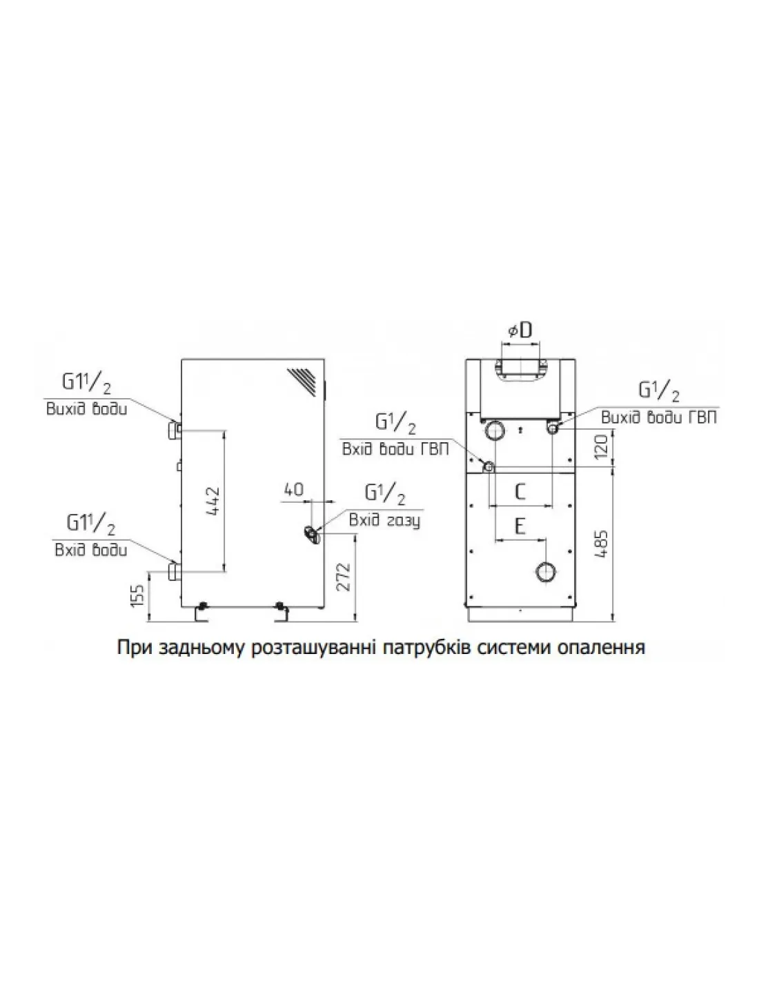- Диаметр входа и выхода контура отопления: 1,5 дюйма;