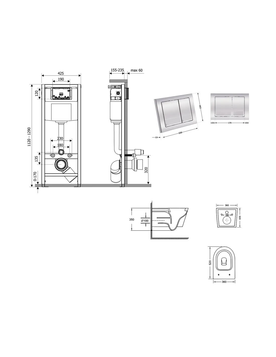 - Габариты унитаза (ДхШхГ) - 520х360х320 мм;