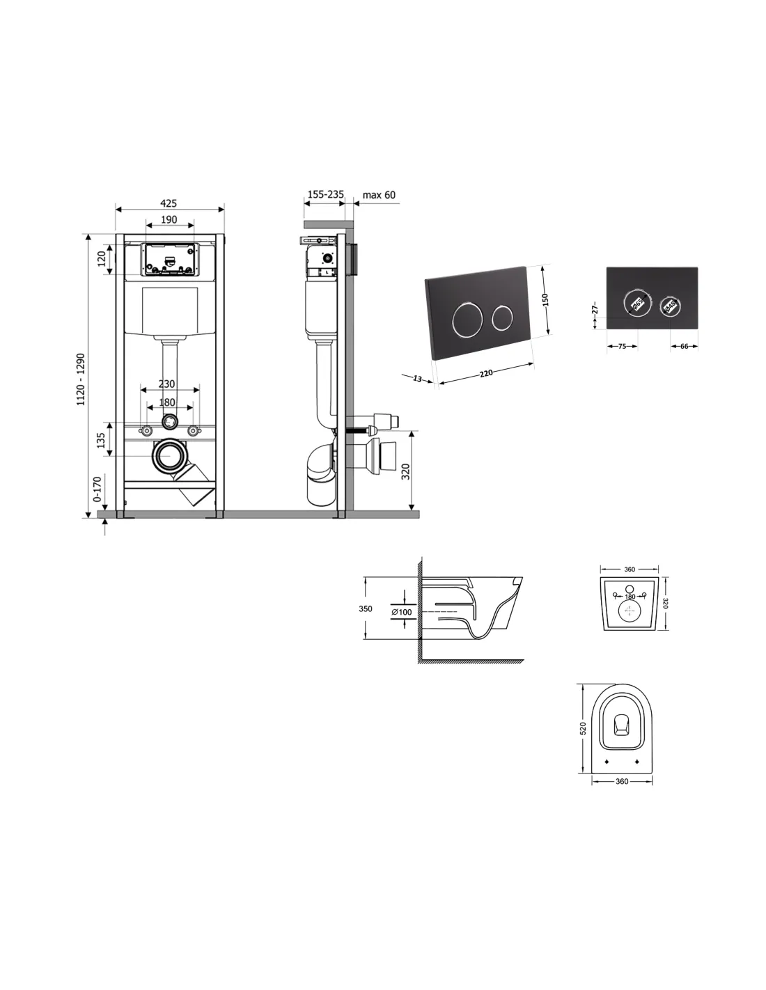 - Габариты унитаза (ДхШхГ) - 520х360х320 мм;