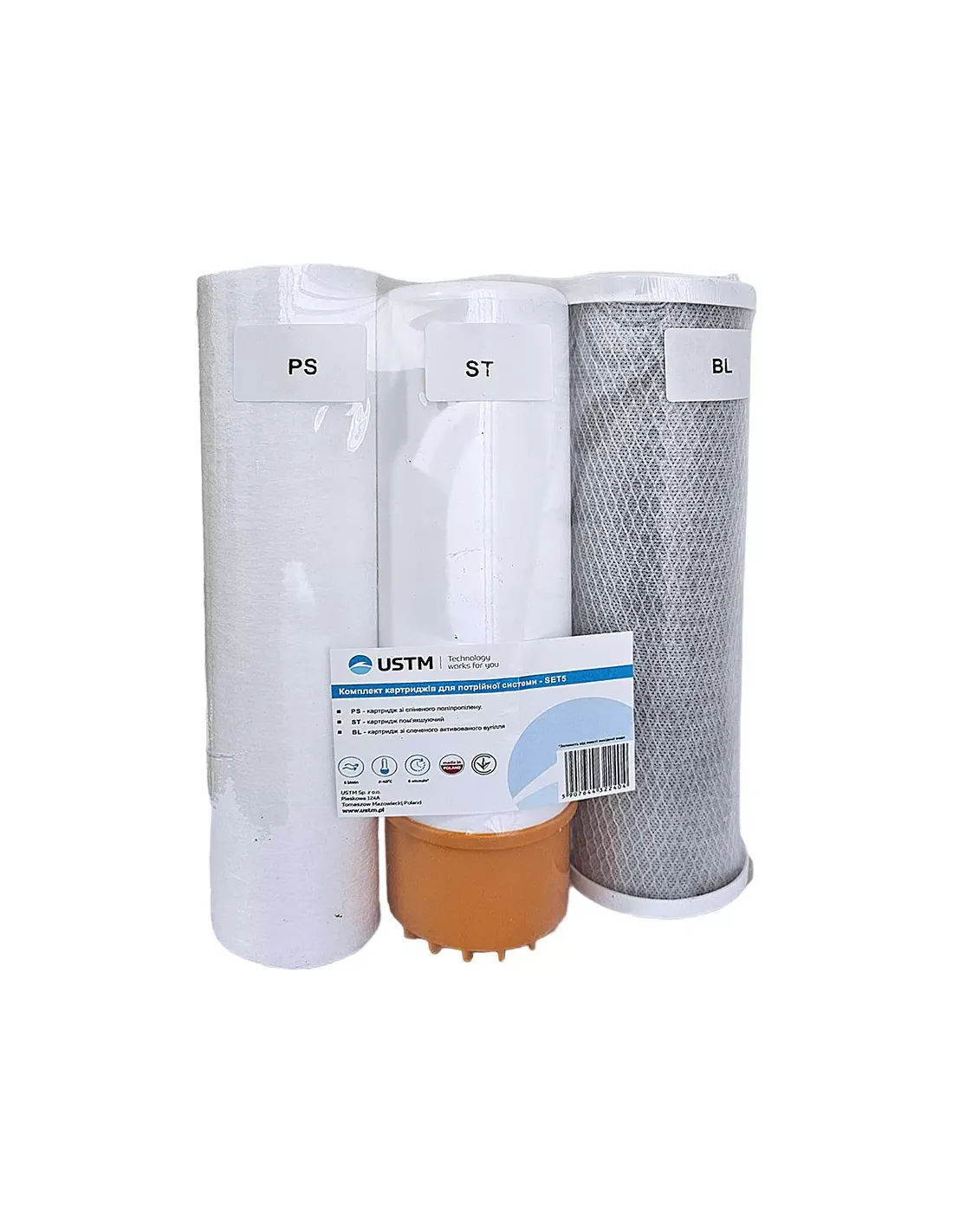 Комплект картриджей для фильтра USTM SET5 состоит из трех стадий очистки: 1-я стадия: механический фильтр. Уровень фильтрации: 5 микрон. Картридж изготовлен на основе полипропилена высокой плотности. Удаляет окисленное железо (ржавчину), частицы ила, глины, песок, микроорганизмы, волокно торфа и прочие примеси органического и неорганического происхождения. 2-я стадия: картридж умягчения воды. Содержит ионообменную смолу. 3-я стадия: картридж из активированного угля. Рейтинг фильтрации: 5 мкм. Картридж изготовлен из высококачественного кокосового активированного спрессованного угля. Принцип работы картриджа основан на поглощении загрязнителей молекулами сорбента. Пористая структура угля позволяет задерживать вредные компоненты органических соединений, пестицидов, фенолов, гербицидов, нитратов, нефтепродуктов, тяжелых металлов, хлора. Замена комплекта картриджей должна производиться не реже одного раза в пол года. Фактический срок службы будет зависеть от качества исходной водопроводной воды.