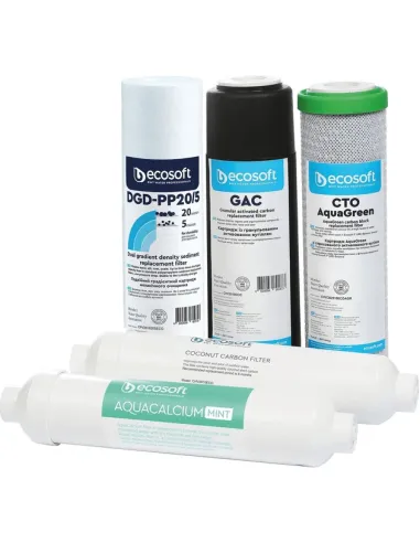 Комплект картриджей для фильтра Ecosoft P`URE AquaCalcium состоит из четырех стадий очистки: 1-я стадия: механический фильтр из спенного полипропилена 5 мкм. Удаляет песок, ил, глину и другие механические примеси. 2-я стадия: гранулированный активированный уголь для удаления хлора и органических соединений. 3-я стадия: спрессованный активированный уголь для доочистки воды перед мембраной. 4-я стадия: линейный картридж-минерализатор для насыщения воды кальцием и улучшения вкусовых качеств. Замена комплекта картриджей должна производиться каждые 6 месяцев. Фактический срок службы зависит от качества исходной воды.