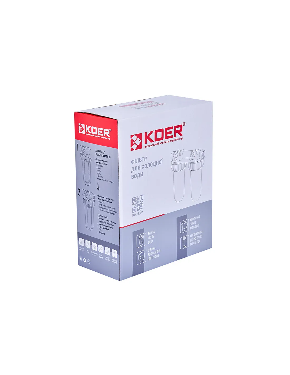 Koer KV-25-1 дюйм магистрального типа, в которой возможно использование любых картриджей стандарта 10 дюймов. В течение срока службы водоочиститель не требует специального обслуживания, кроме своевременной замены фильтрующего модуля.