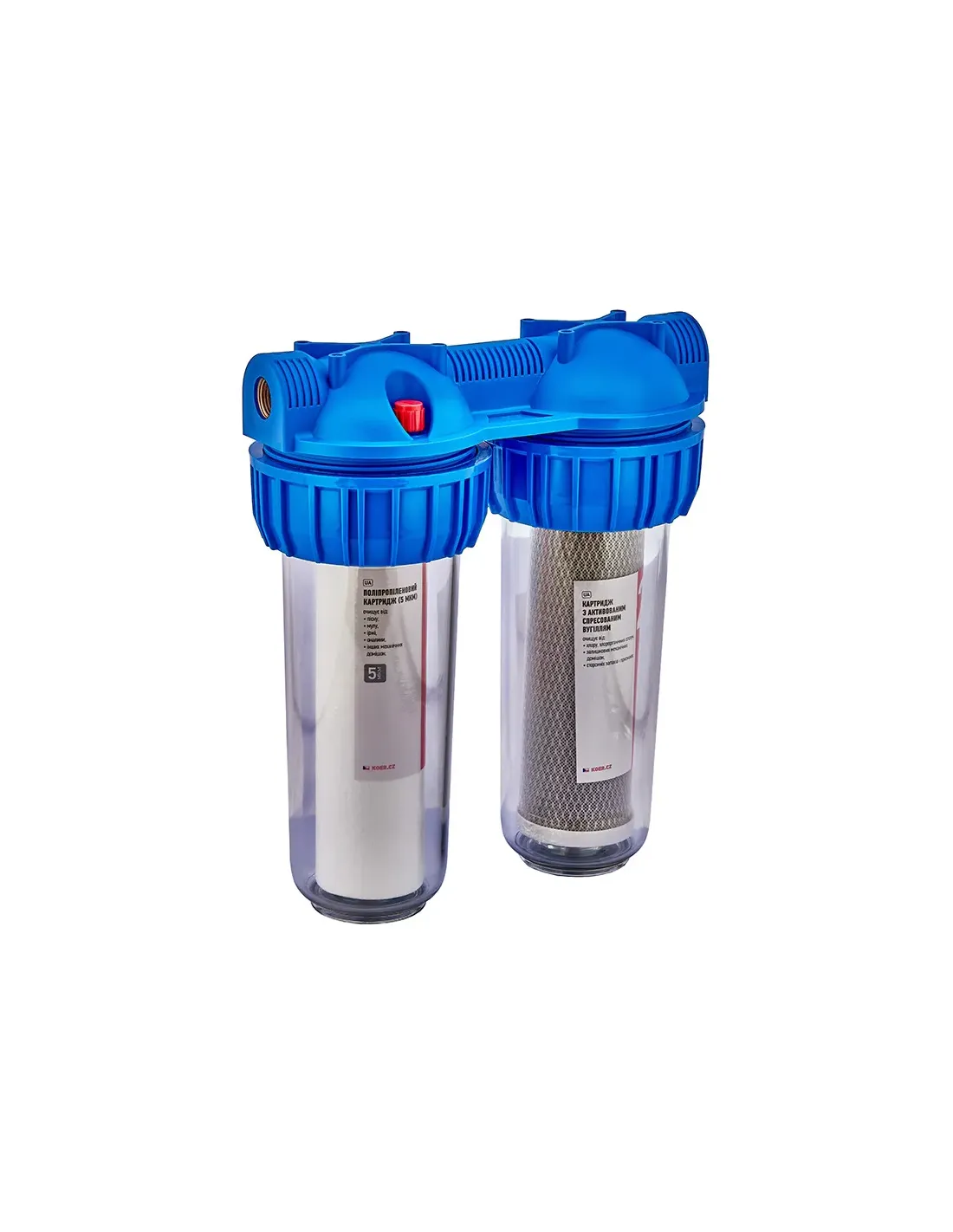 Магистральный фильтр для очистки воды Koer KV-25-1 1 дюйм подключения предназначен для очистки водопроводной воды от ржавчины, песка, окалин, активного хлора, органических веществ и тяжелых металлов. Состоит из двух колб с присоединительными размерами подключения 1 дюйм. В зависимости от типа используемых сменных картриджей, обеспечивает как базовую, так и глубокую очистку воды, при этом напор остается практически без изменений. Прочный пластиковый корпус фильтра устойчив к механическим нагрузкам до 8 Бар и рассчитан на долгую бесперебойную службу. Колбы соединены между собой в верхней части пластиковым соединением. Комплектация: 2 корпуса фильтра, 2 картриджа из вспененного полипропилена и с активированным спрессованным углем, кронштейн, сервисный ключ, шурупы для крепления кронштейна. Диаметр резьбовых подключений: 1 дюйм. Резьбовое соединение изготовлено из латуни. Гарантия 12 месяца. Страна производитель - Чехия.