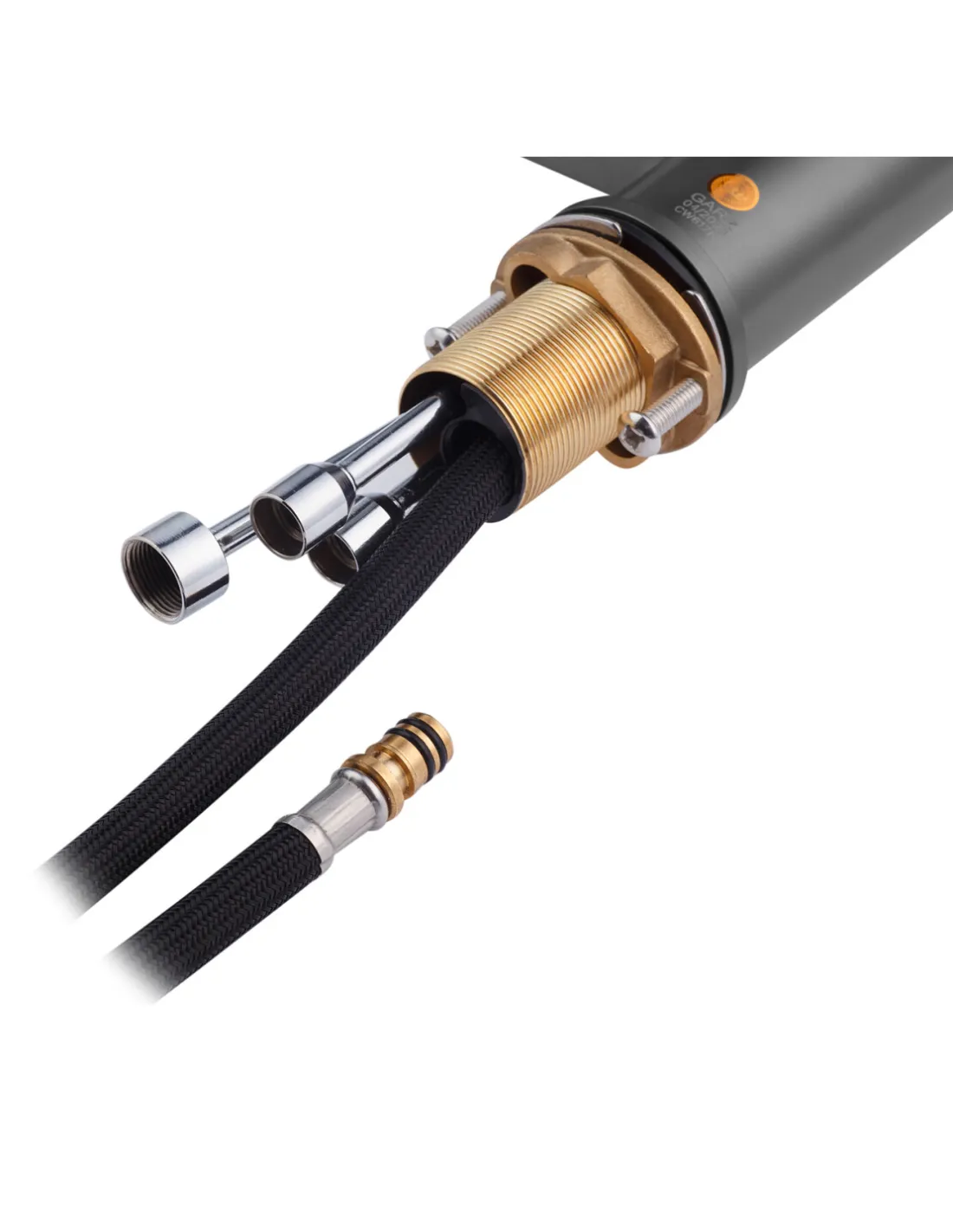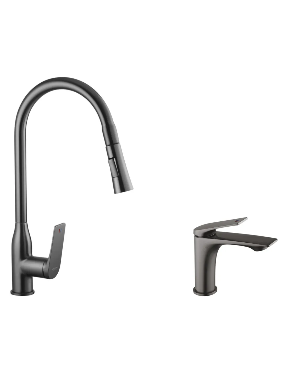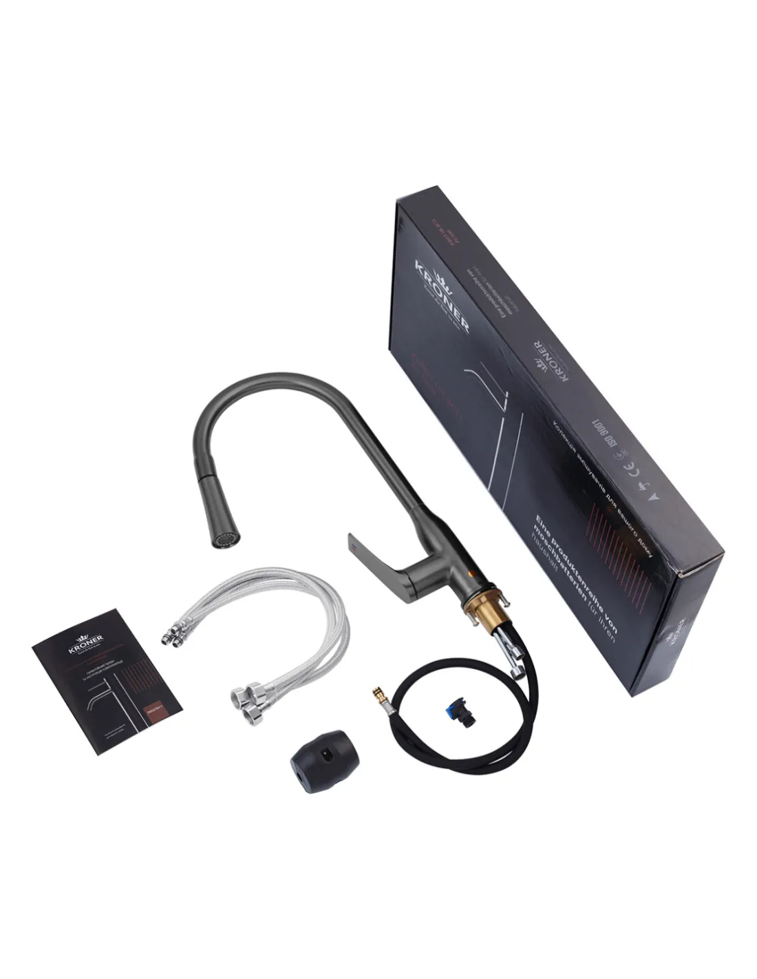 Набор смесителей Kroner для кухни Graz-GRP030-T и смеситель для раковины Graz-GRP010 предназначен для функционального и стильного оснащения кухонного пространства. Используется для подачи воды на кухонную мойку и раковину с возможностью смешивания горячей и холодной воды. В комплект входят выдвижной смеситель с U-образным изливом, смеситель для раковины, гибкая подводка, шланг для выдвижной лейки, лейка, крепежи и инструкция. Изготовлены из высококачественной латуни с глянцевым графитовым покрытием. Управление однорычажное на картриджном механизме. Гарантия на смесители – 60 месяцев. Страна производитель – Чехия.