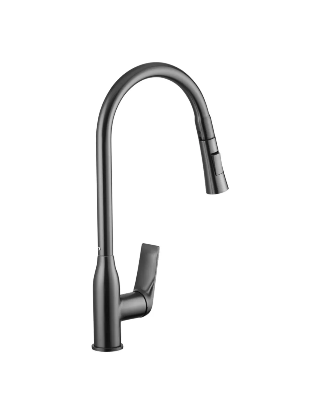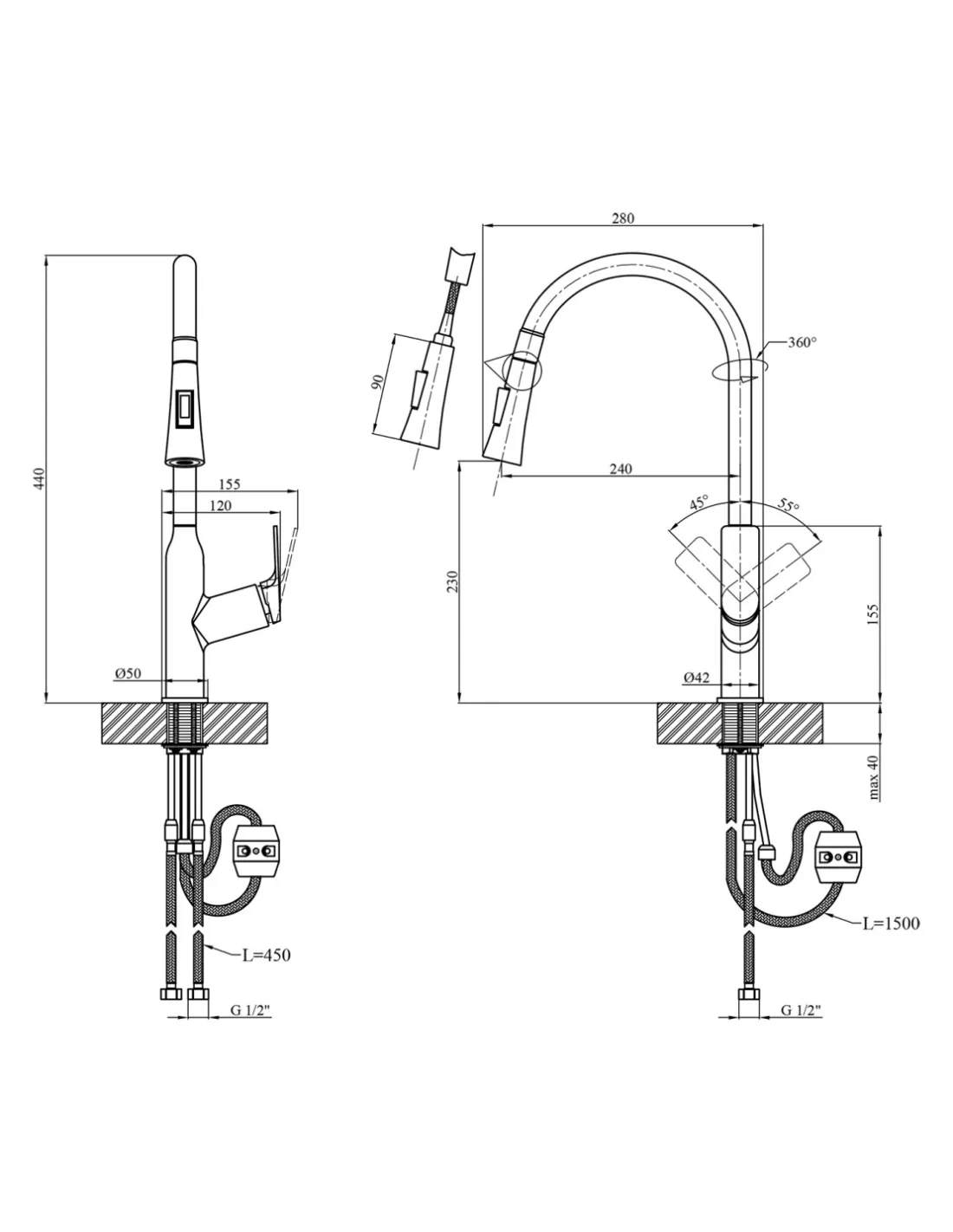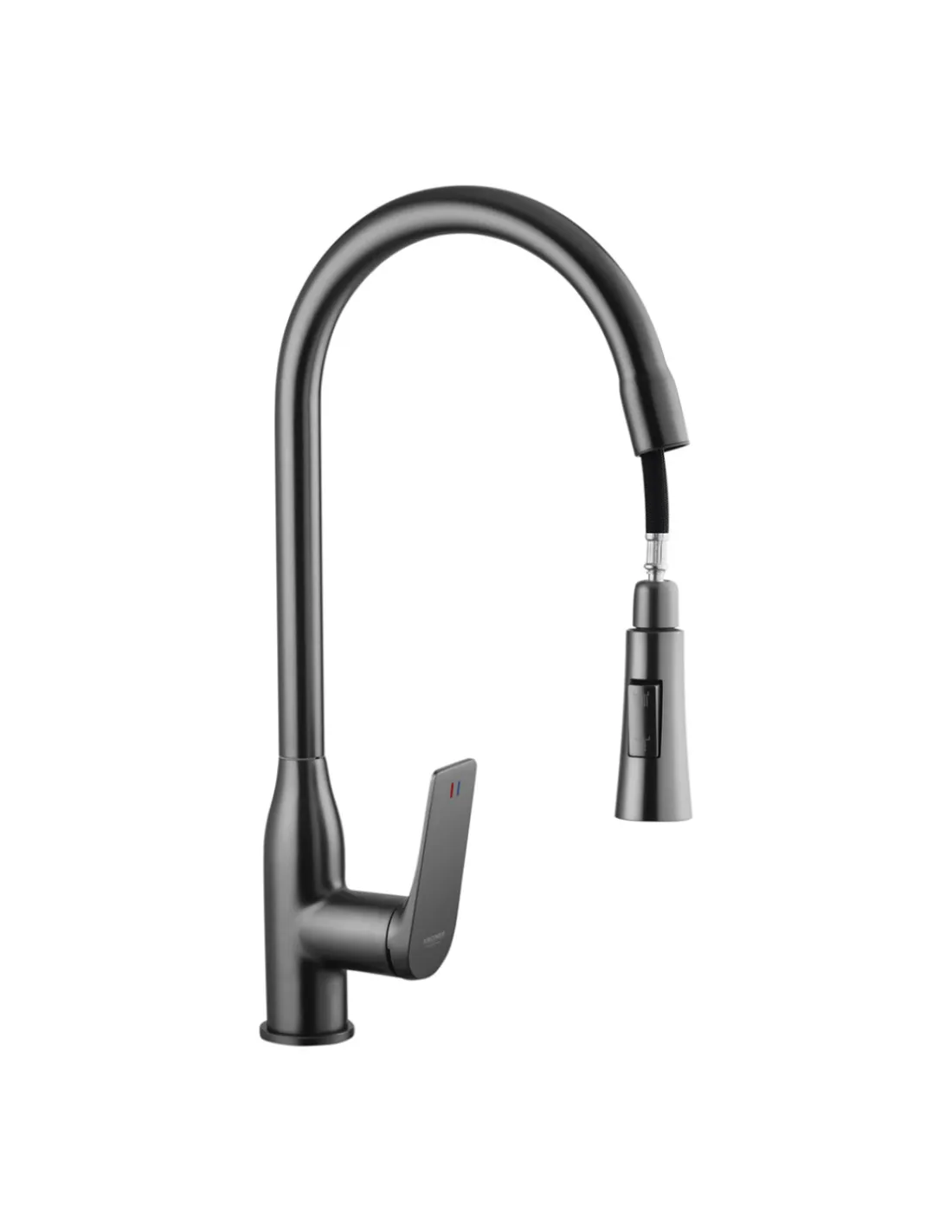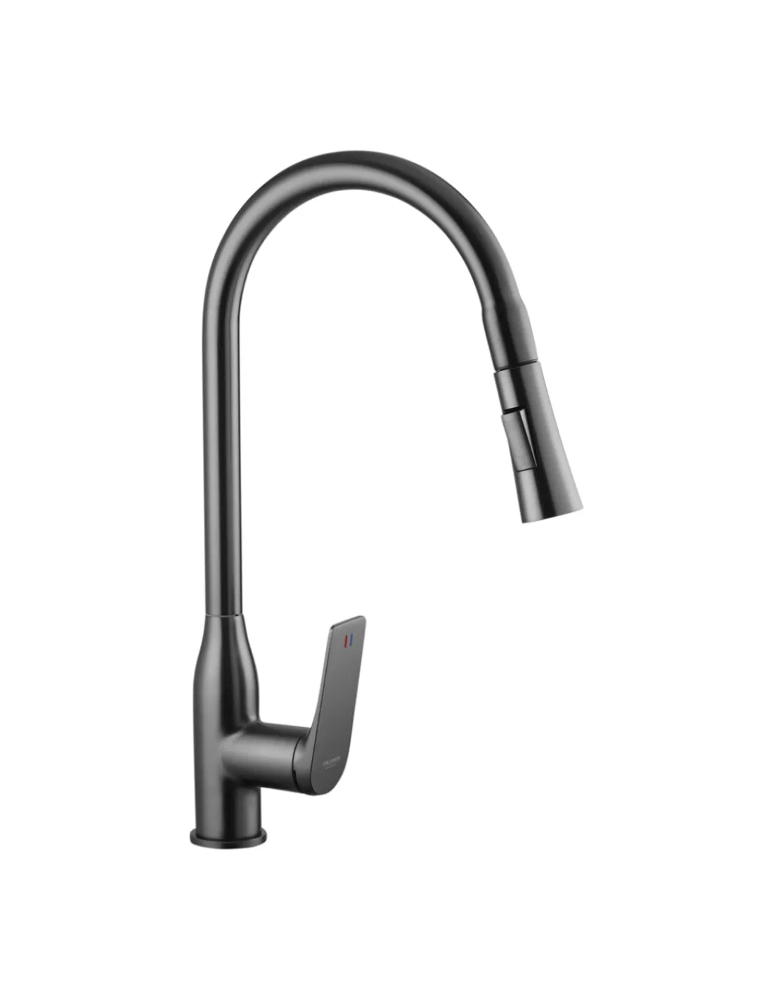Набор оснащен однорычажным управлением. Регулировка напора воды осуществляется поднятием и опусканием рычага, а настройка комфортной температуры – поворотом вправо или влево. Выдвижной смеситель оснащен U-образным изливом и шлангом для удобного использования на кухне.