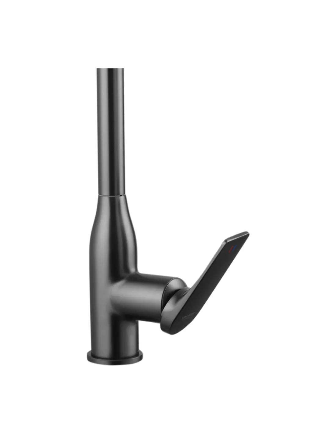 Изделия выполнены из высококачественной латуни, устойчивой к коррозии и долговечной в эксплуатации. Глянцевое графитовое покрытие придает смесителям современный и элегантный вид, а современный картриджный механизм обеспечивает плавное и точное регулирование температуры и напора воды.