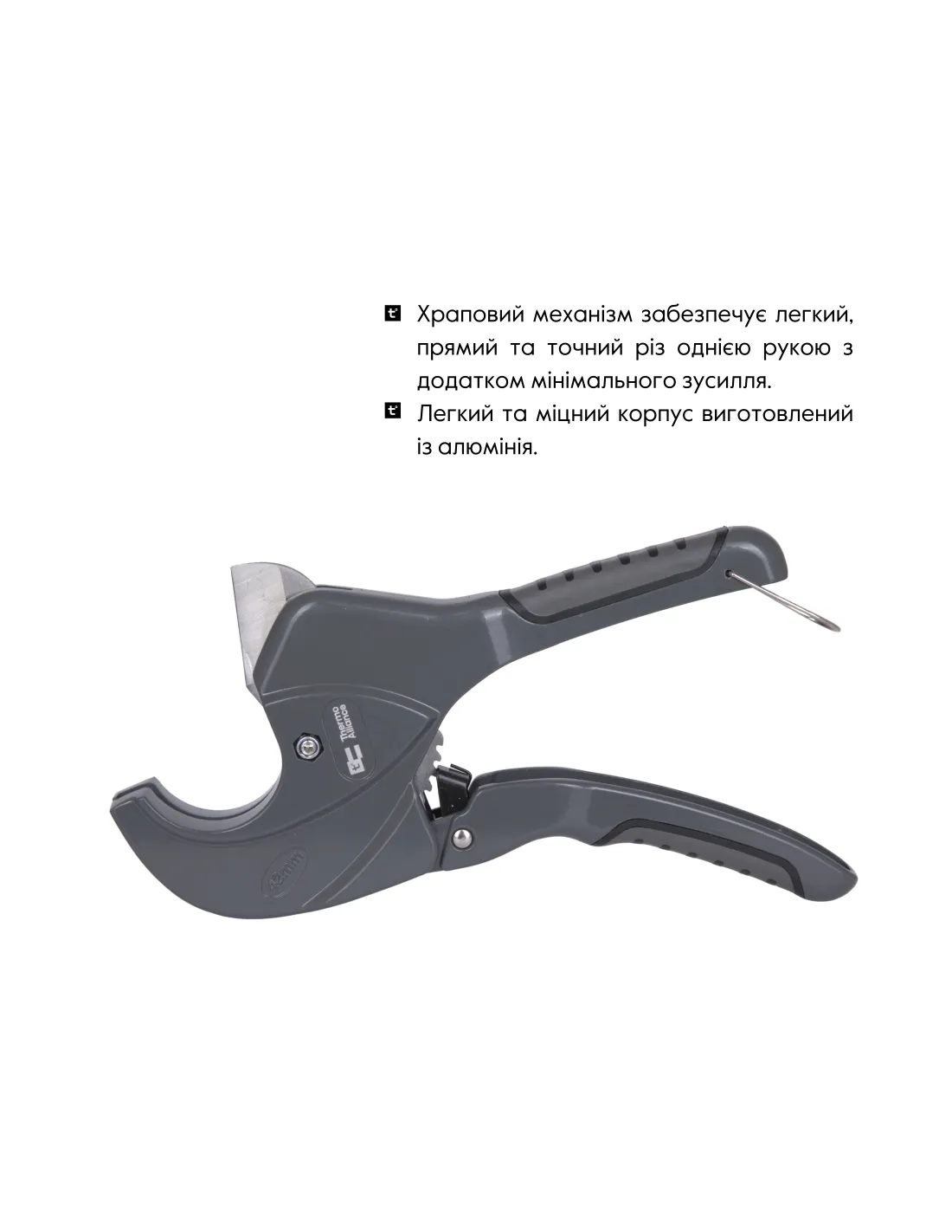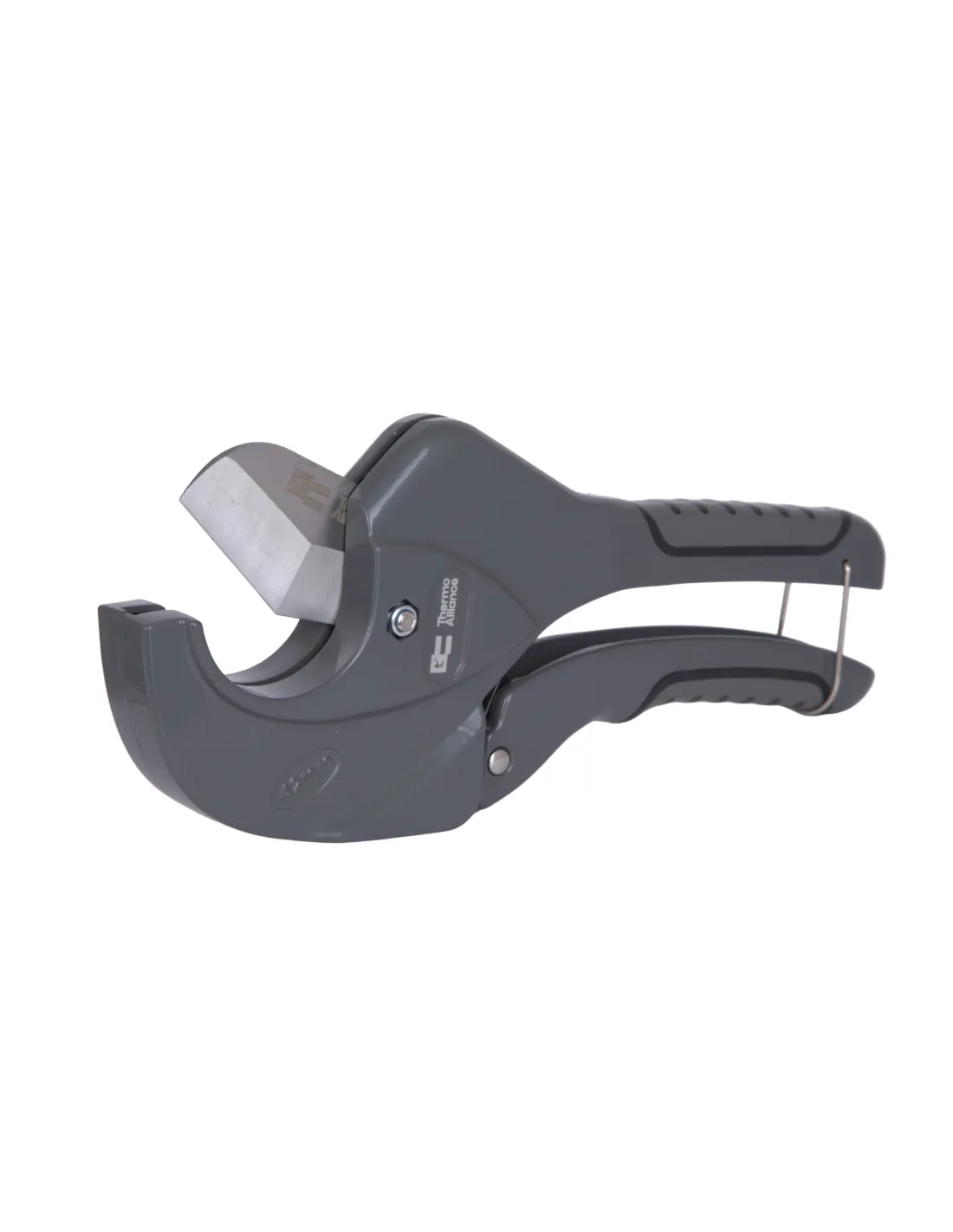 Ножницы для пластиковых труб Thermo Alliance PRO-002 - это профессиональный инструмент для резки пластиковых труб диаметром до 40 мм. Лезвия изготовлены из высококачественной нержавеющей стали с тефлоновым покрытием, что обеспечивает долговечную режущую способность. Храповой механизм позволяет выполнять точный и ровный срез труб одной рукой с минимальными усилиями. Удобная ручка с антискользящим покрытием. Легкий и крепкий корпус изготовлен из алюминиевого сплава.