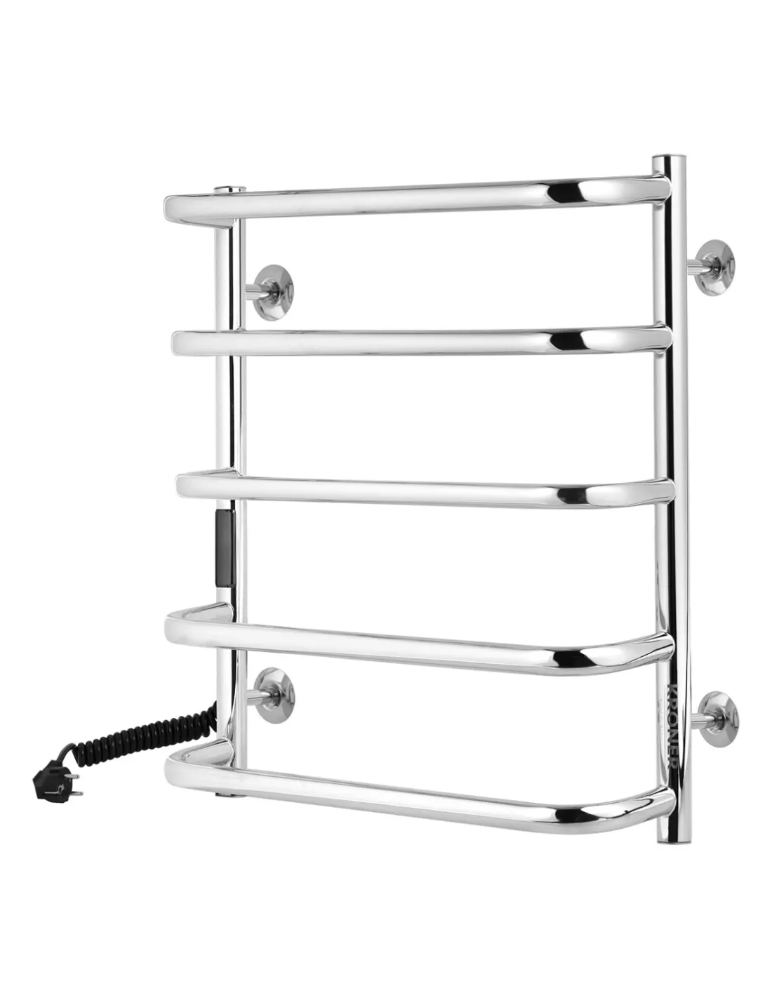 Электрический полотенцесушитель Kroner KRP Stil EL600x500-5 выполнен из нержавеющей стали AISI 304 с глянцевой поверхностью, оснащен ТЭН и встроенным терморегулятором. Он быстро нагревается и поддерживает температуру до 60 градусов Цельсия. Управление режимами работы осуществляется через терморегулятор. Подключение к сети выполняется через электрический провод с вилкой.
