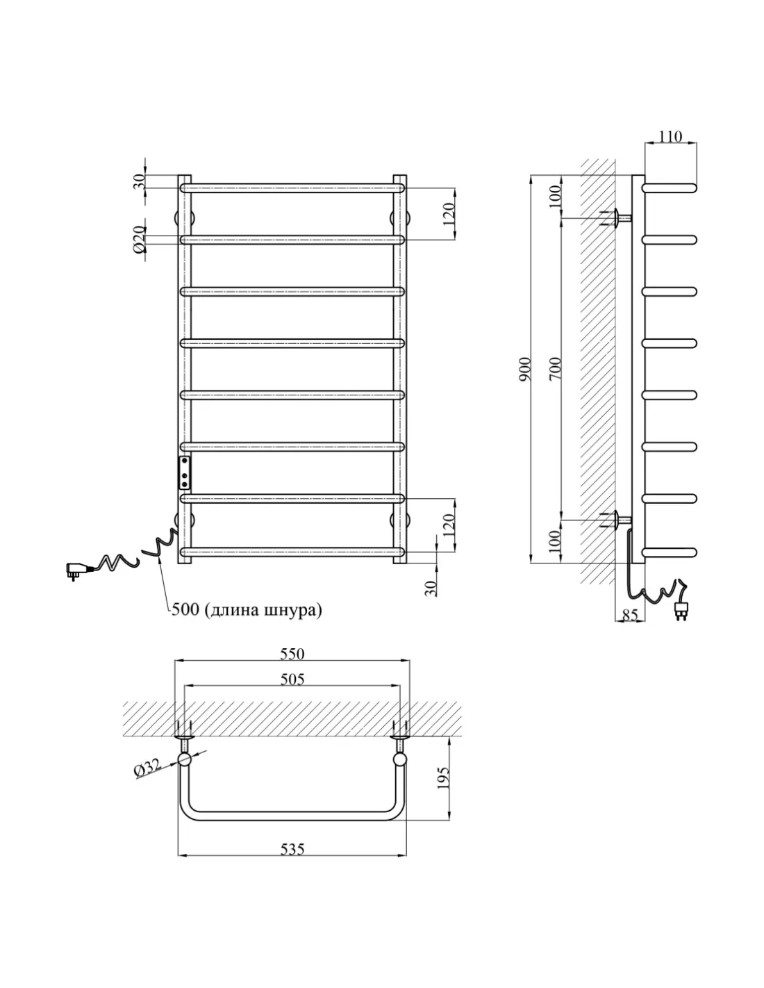 Полотенцесушитель электрический Kroner KRP Stil EL900x500-8 предназначен для установки в ванной комнате. Используется для сушки полотенец и белья, а также для дополнительного обогрева помещения. Габариты изделия 900 мм – высота, 550 мм – ширина, 195 мм – глубина. Тип установки – настенный, с левым подключением. Принцип работы – подключение к сети 220 В через электропровод с вилкой. Для удобства эксплуатации предусмотрен встроенный терморегулятор. Гарантия на изделие 20 лет (на сварную конструкцию) и 12 месяцев (на терморегулятор). Страна-производитель – Украина.