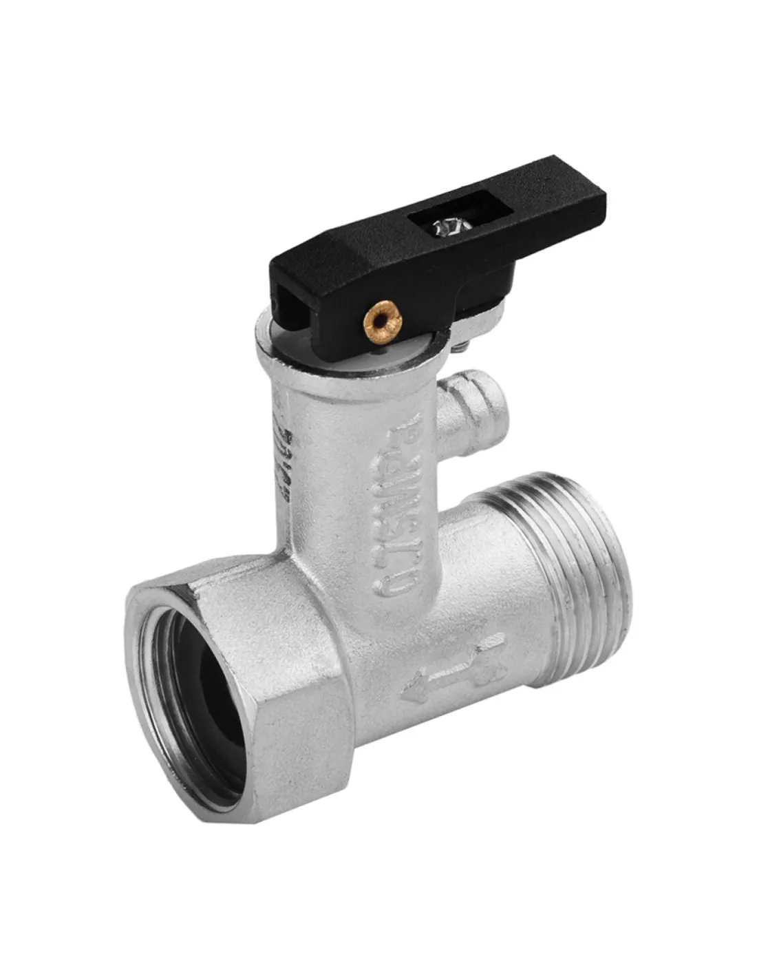 Изготовлен из прочной латуни с никелированным покрытием, которое защищает от коррозии и продлевает срок службы изделия. Конструкция с ручкой обеспечивает удобство обслуживания и контроля работы клапана. Диаметр подключения — 1/2 дюйма, резьбовое соединение внутреннее/наружное, что делает установку простой и универсальной. Рабочее давление — 7 бар, температура эксплуатации — до 130 градусов по Цельсию.