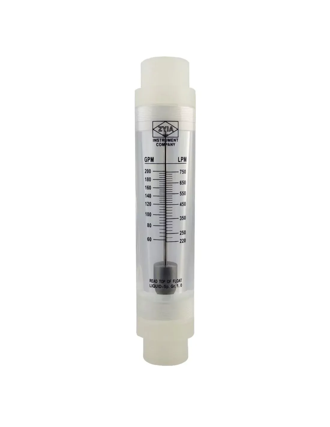 Ротаметр трубного типа Raifil LZM-50GB 60-200 GPM – прибор определения объемного расхода воды за единицу времени. Состоит из прозрачного корпуса с отсеком для воды и поплавка. В зависимости от интенсивности потока поплавок поднимается на определенный уровень, которому соответствует значение на шкале. Монтируется на вертикальном трубопроводе с направлением течения снизу вверх. Измерение скорости потока воды в данной модели GPM от 60 до 200 галлон в минуту.