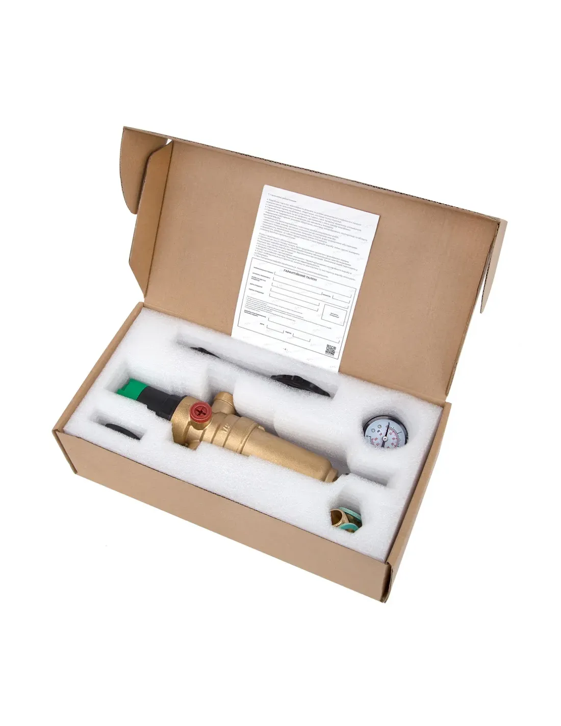 Данный фильтр должен быть установлен на горизонтальном участке трубопровода сливным клапаном вниз, а направление потока должно соответствовать направлению стрелки на корпусе фильтра. Корпус и фитинги сделаны из латуни, изделие укомплектовано манометром и редуктором давления. Дренажный клапан со шланговым штуцером позволяет производить как прямую, так и обратную промывку фильтра.