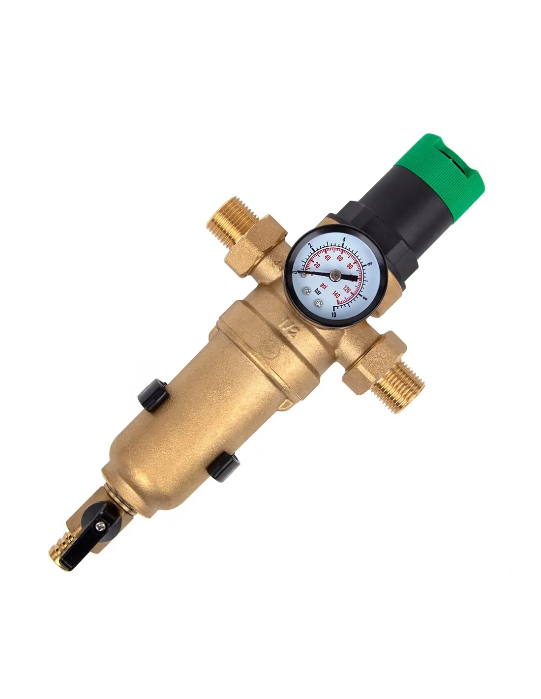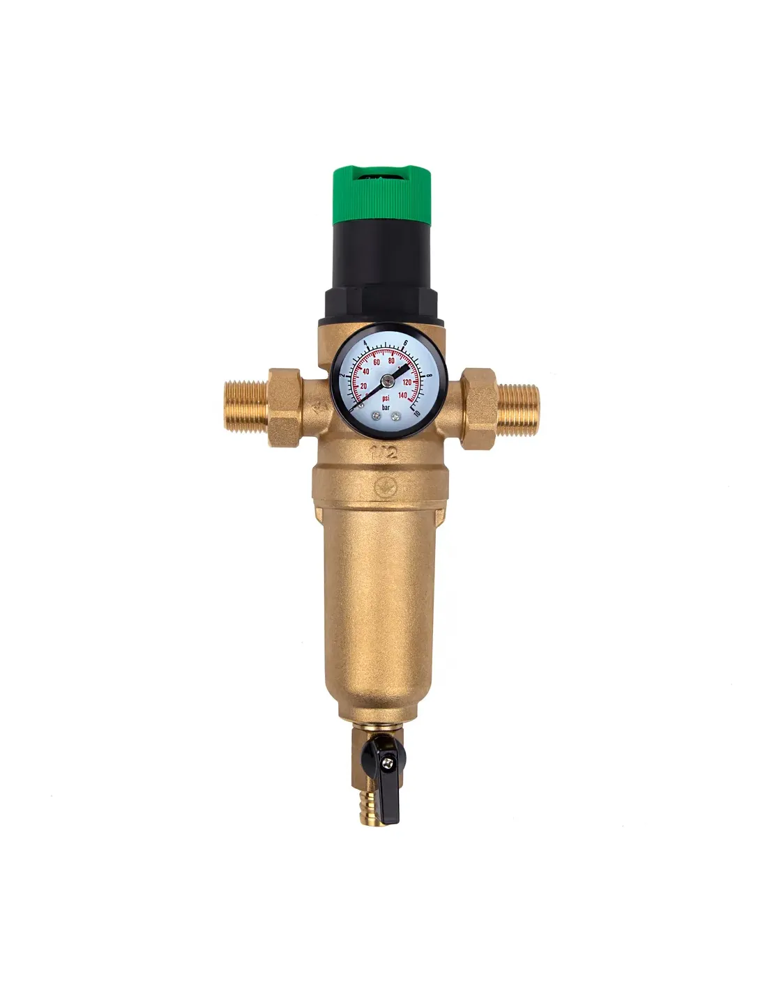 Данный фильтр должен быть установлен на горизонтальном участке трубопровода сливным клапаном вниз, а направление потока должно соответствовать направлению стрелки на корпусе фильтра. Корпус и фитинги сделаны из латуни, изделие укомплектовано манометром и редуктором давления. Дренажный клапан со шланговым штуцером позволяет производить как прямую, так и обратную промывку фильтра.