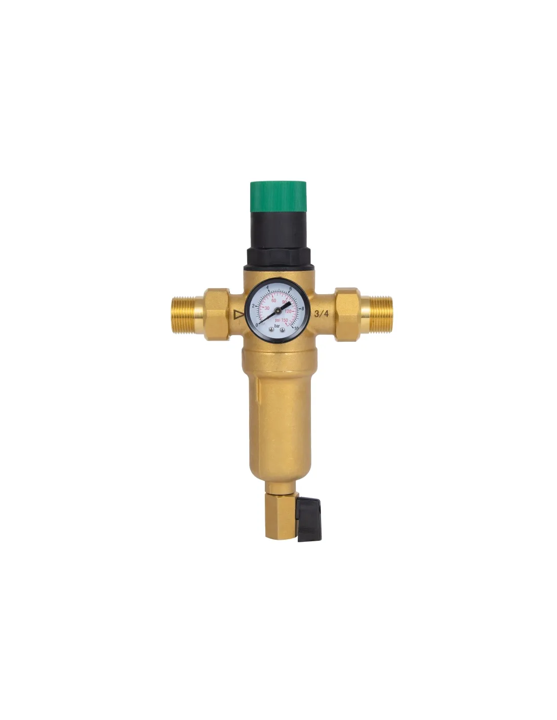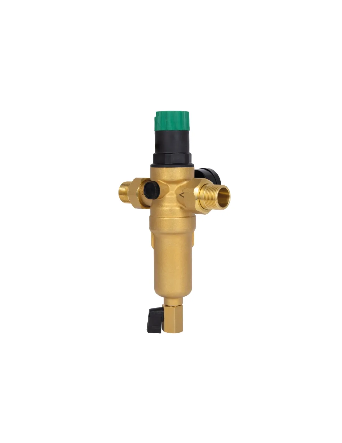 Данный фильтр должен быть установлен на горизонтальном участке трубопровода сливным клапаном вниз, а направление потока должно соответствовать направлению стрелки на корпусе фильтра. Корпус и фитинги сделаны из латуни, изделие укомплектовано редуктором давления и манометром со шкалой измерений от 0 до 10 бар. Дренажный клапан со шланговым штуцером позволяет производить как прямую, так и обратную промывку фильтра.