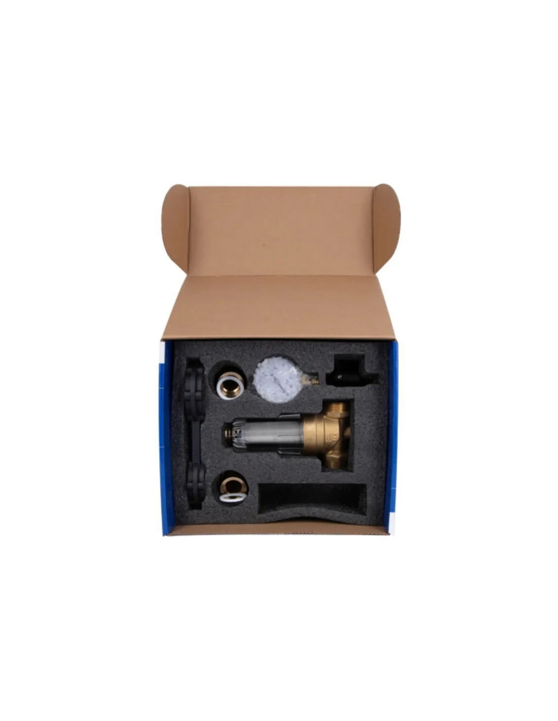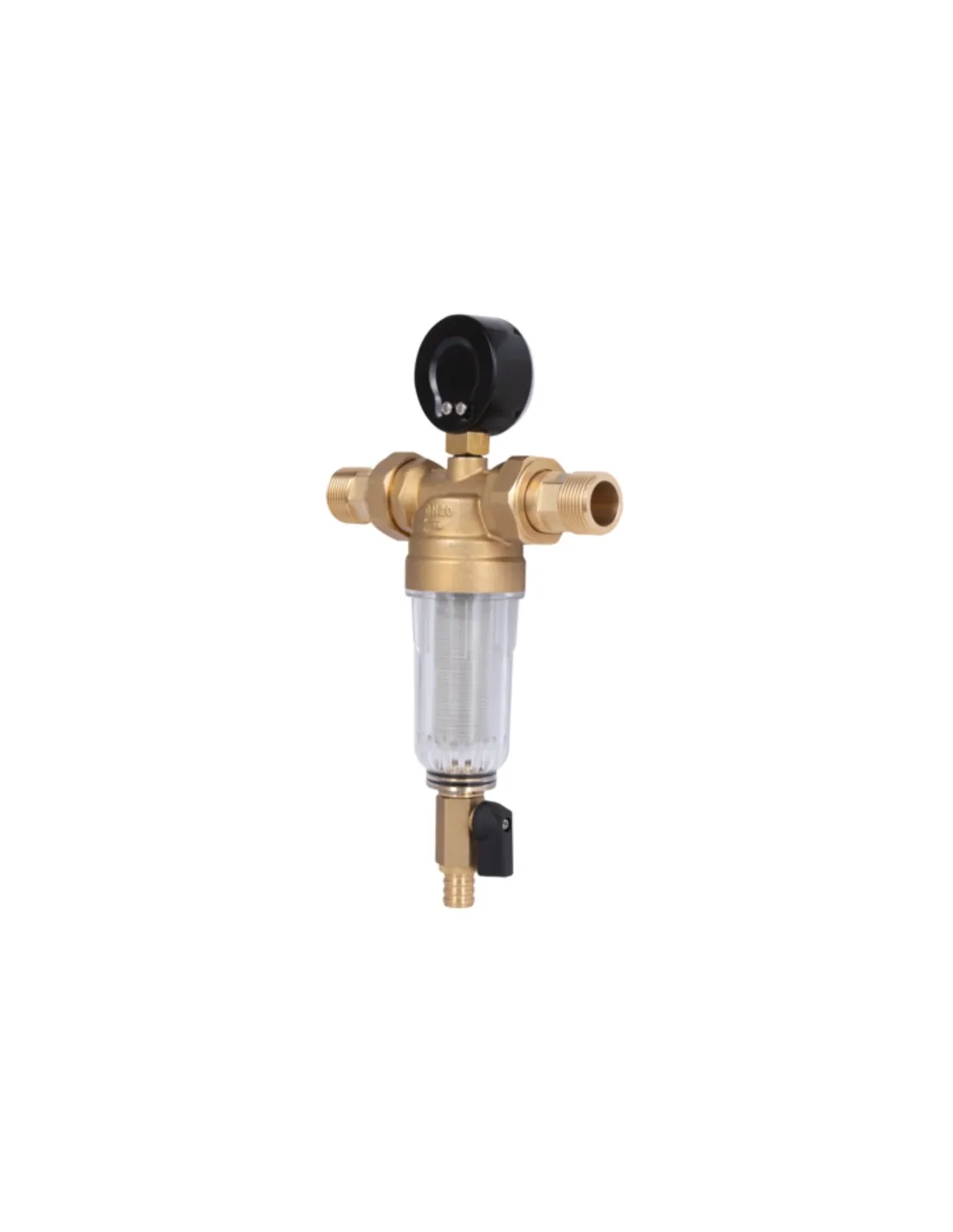 Данный фильтр должен быть установлен на горизонтальном участке трубопровода сливным клапаном вниз, а направление потока должно соответствовать направлению стрелки на корпусе фильтра. Корпус и фитинги сделаны из латуни, изделие укомплектовано манометром со шкалой измерений от 0 до 10 бар. Дренажный клапан со шланговым штуцером позволяет производить как прямую, так и обратную промывку фильтра.
