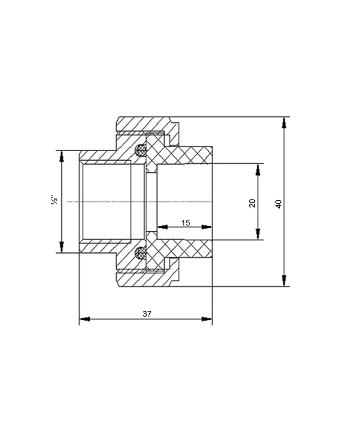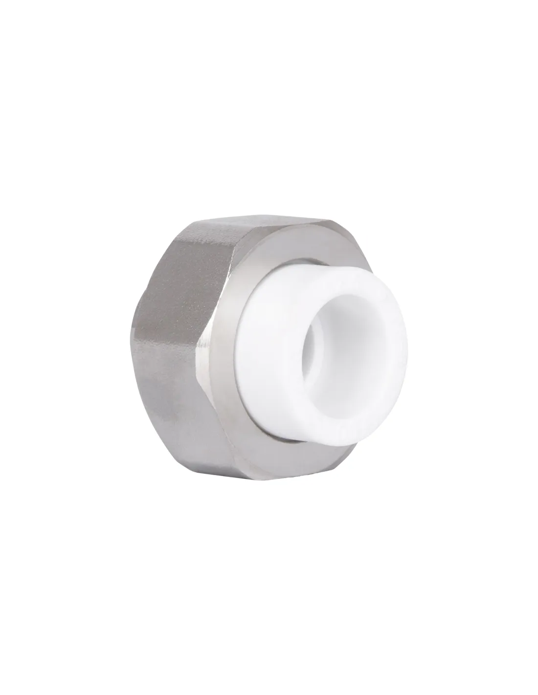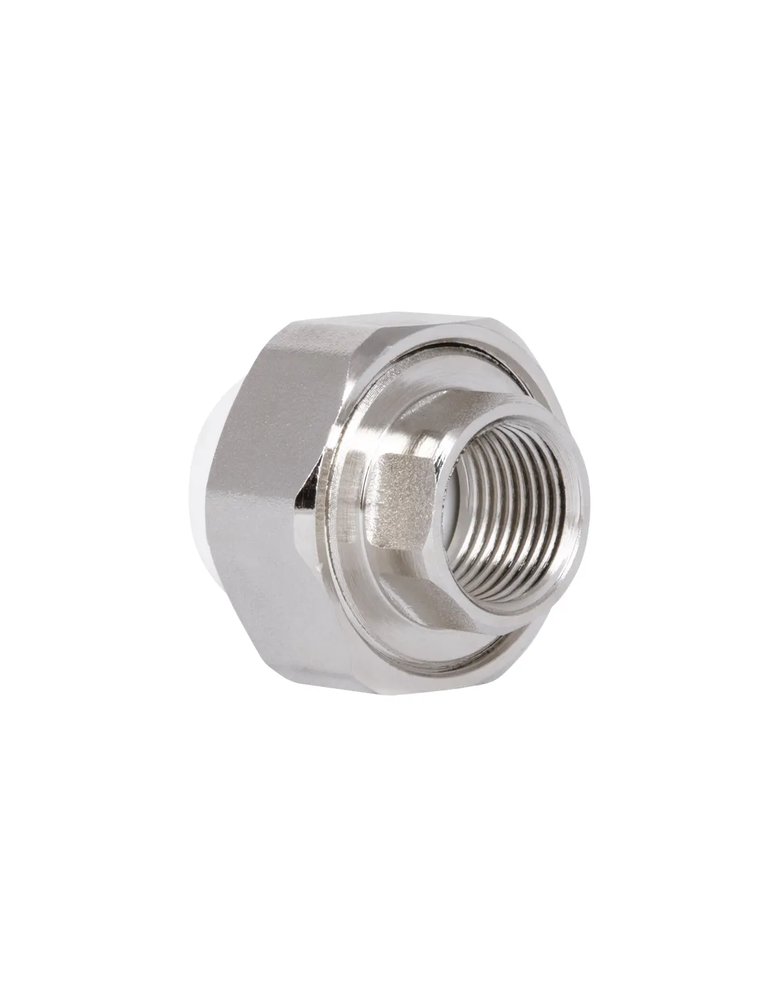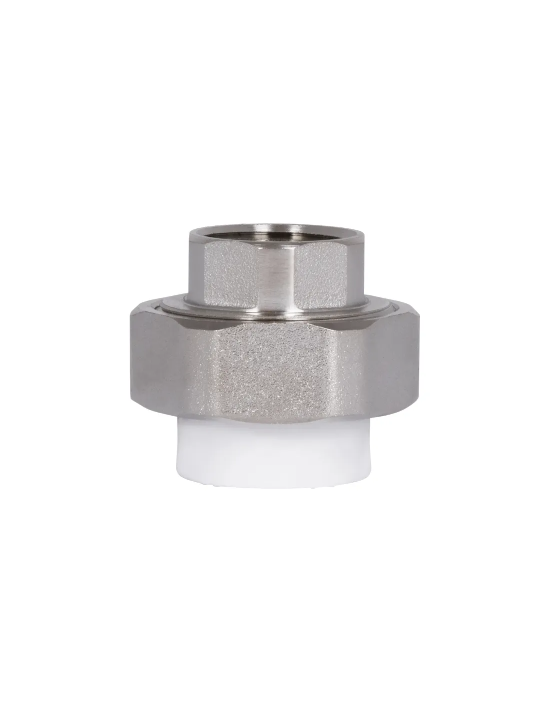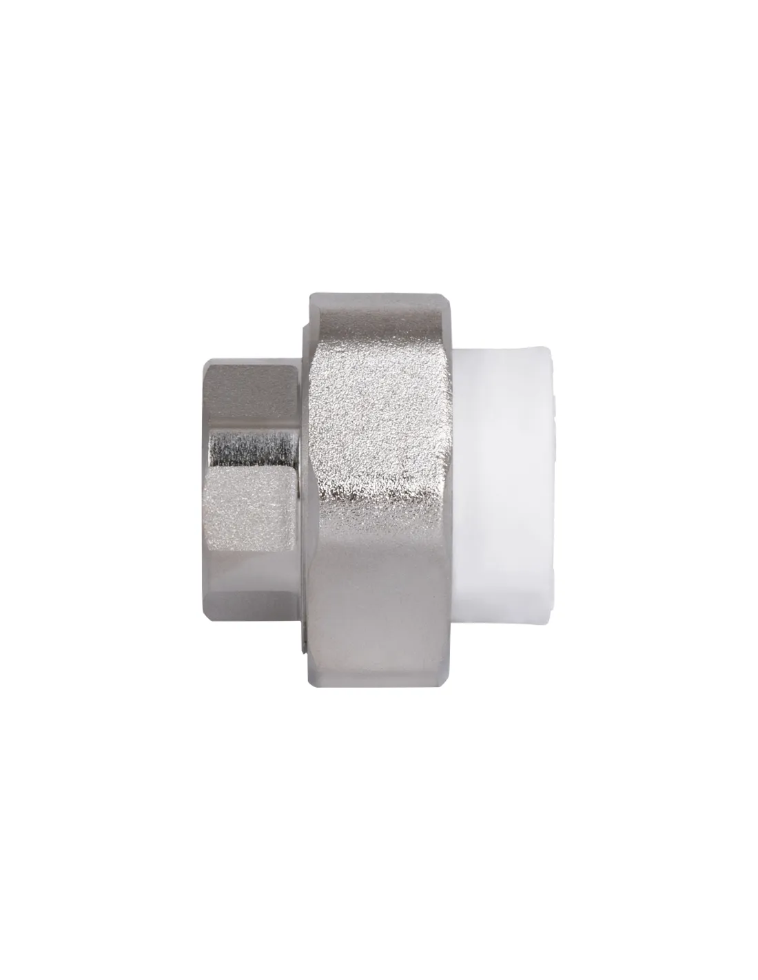 Фитинг состоит из двух частей, соединяемых накидной гайкой, что создает герметичное уплотнение. Латунная головка с никелевым покрытием гарантирует высокую прочность и устойчивость к коррозии и высоким температурам, что критически важно для систем ГВС и отопления. Полипропиленовый корпус белого цвета обеспечивает надежную сварку с трубой, создавая монолитное и долговечное соединение. Максимальное рабочее давление фитинга составляет 20 бар.
