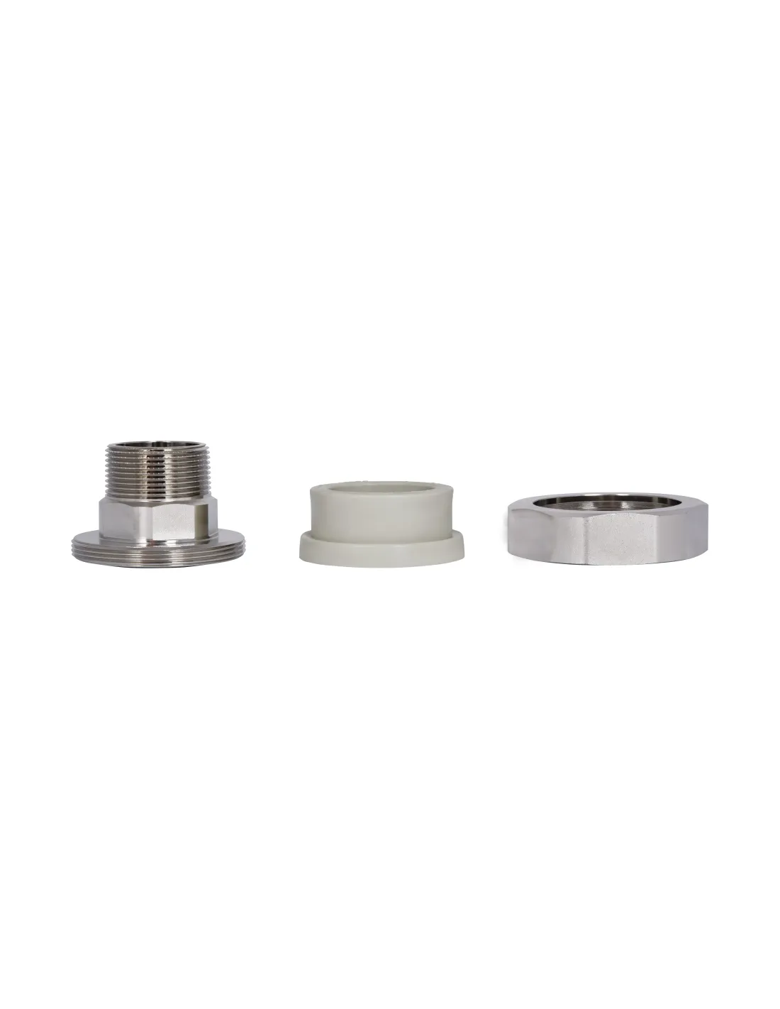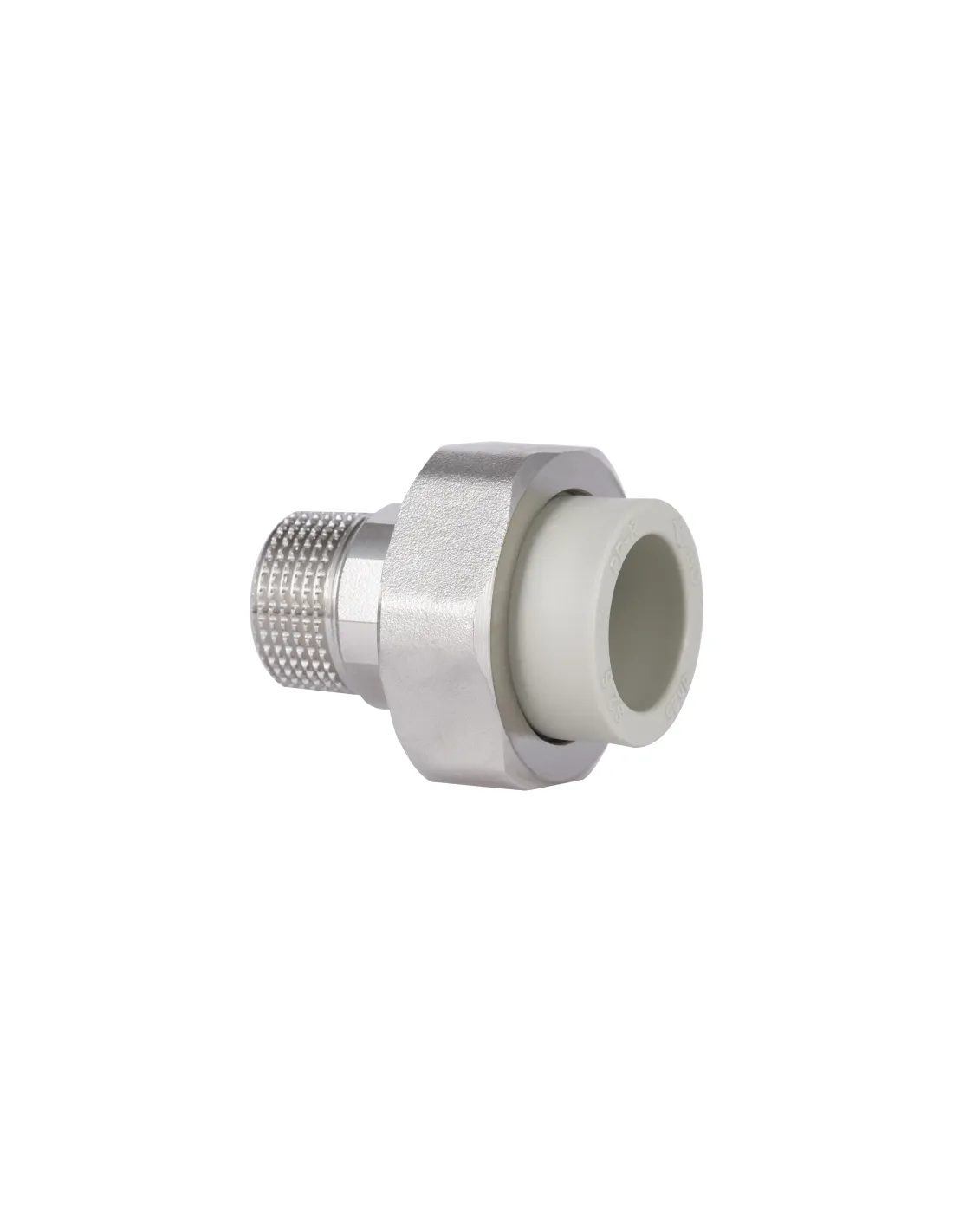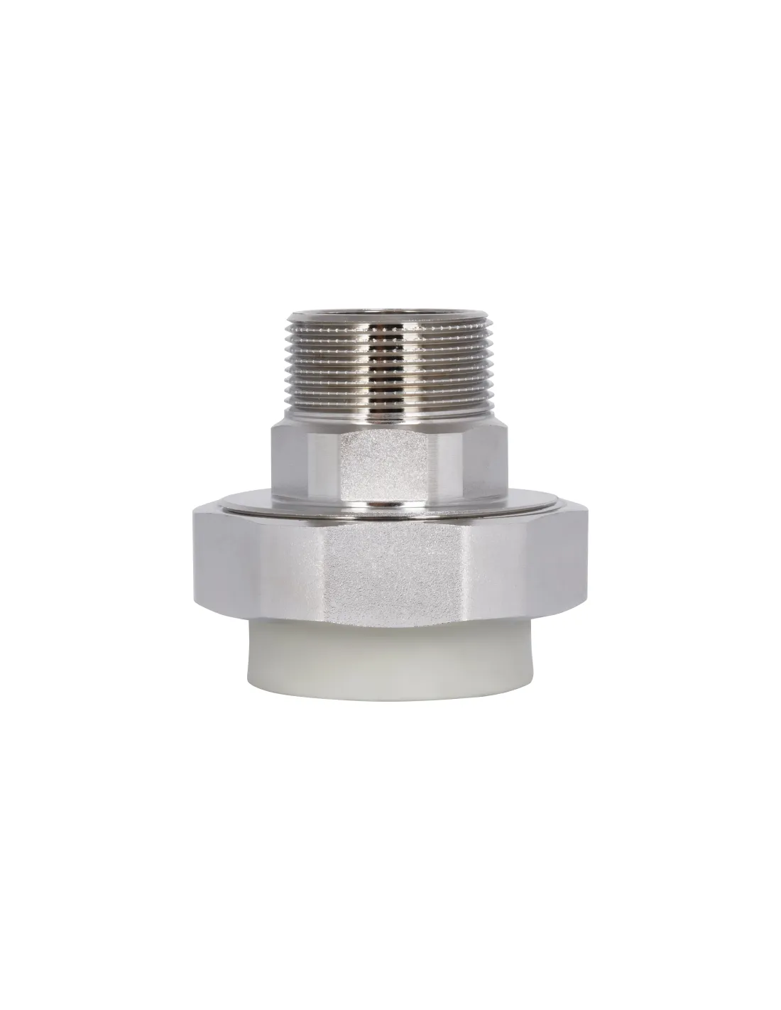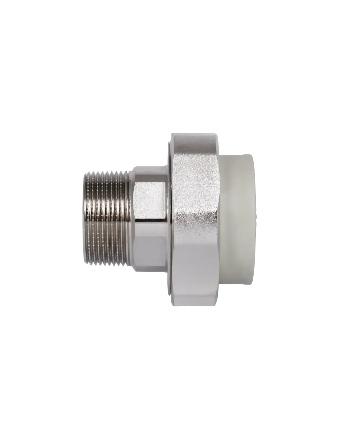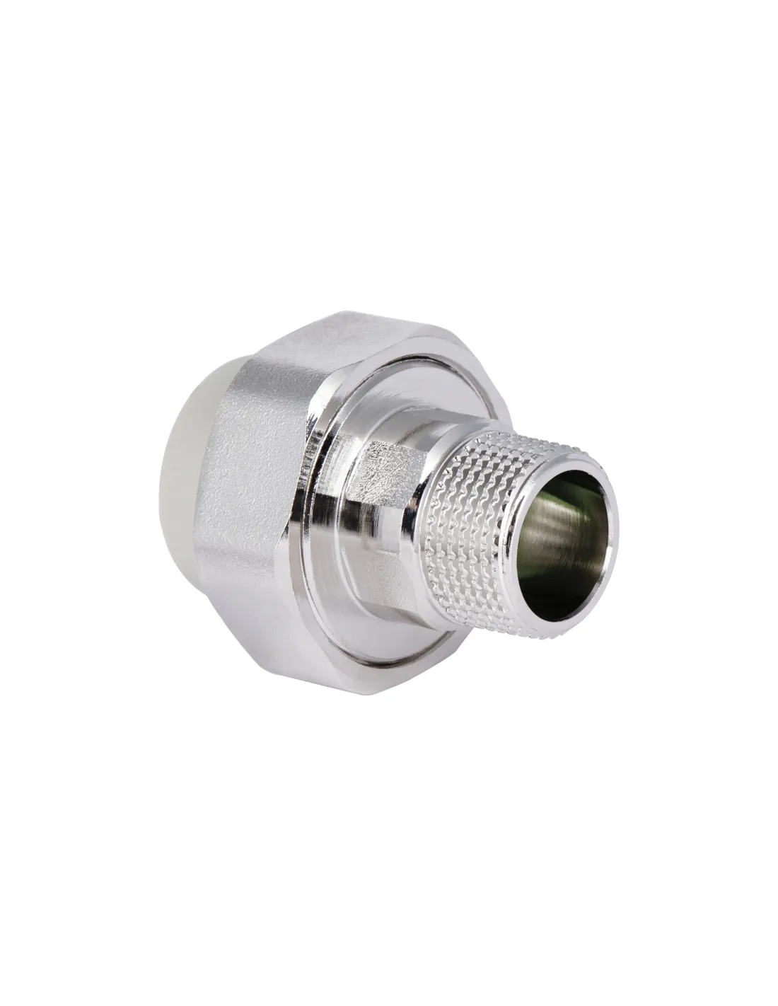 Фитинг выполнен из высококачественного полипропилена PPR PN20 и оснащен латунным резьбовым элементом с накидной гайкой. Латунь обеспечивает прочность и коррозионную стойкость резьбы. Сварное соединение PPR-части гарантирует монолитность и герметичность системы при рабочем давлении до 20 бар.