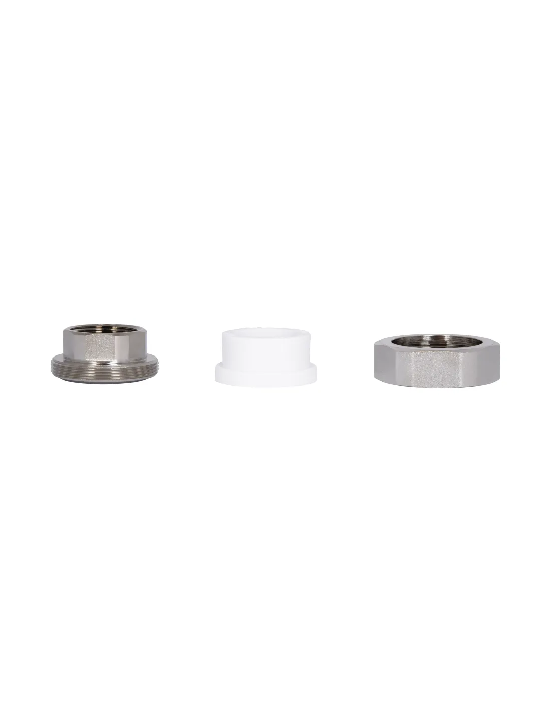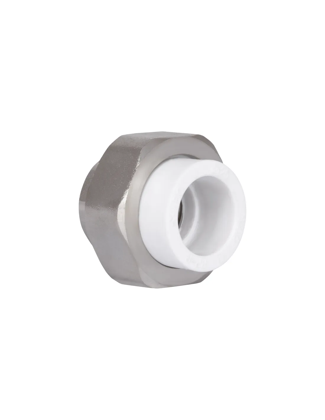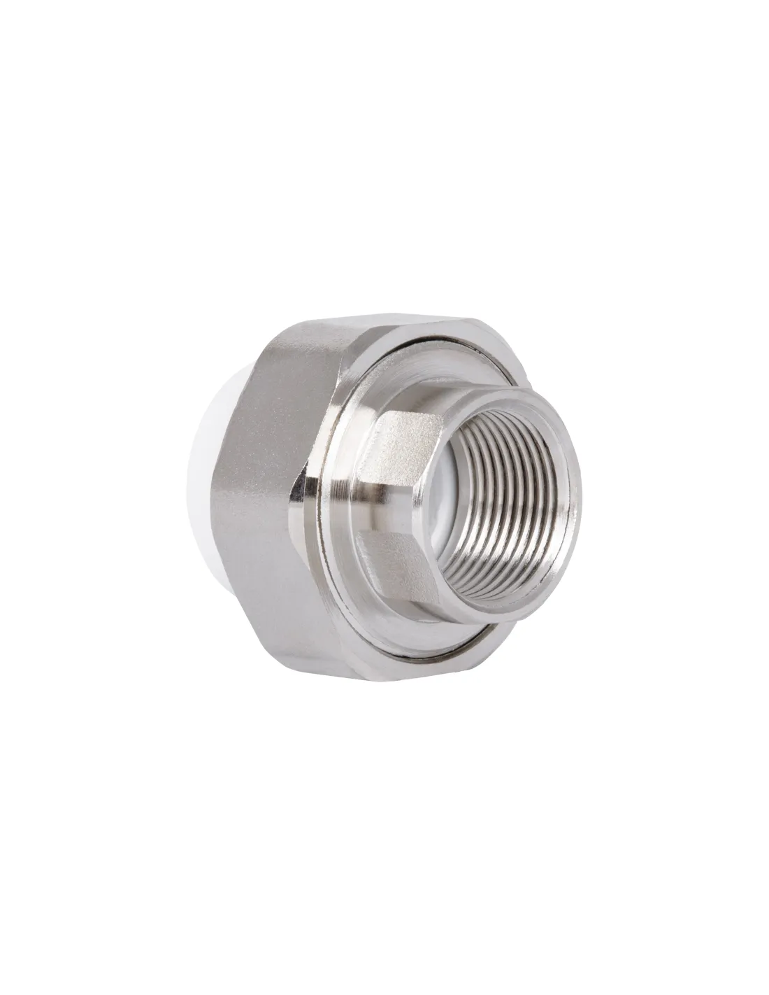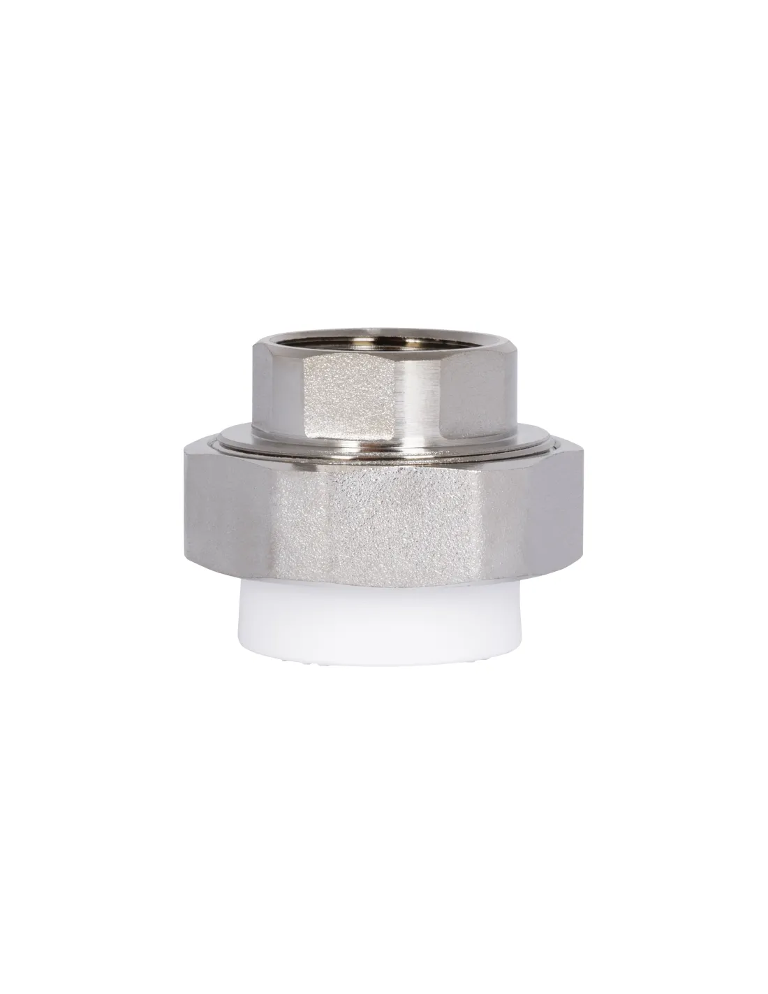 Фитинг состоит из двух частей, соединяемых накидной гайкой. Резьбовой элемент выполнен из высококачественной латуни, которая обеспечивает устойчивость к давлению, высоким температурам и коррозии. Корпус из PPR белого цвета гарантирует прочное сваривание с трубой, создавая монолитное и долговечное соединение. Рабочее давление фитинга составляет 20 бар.