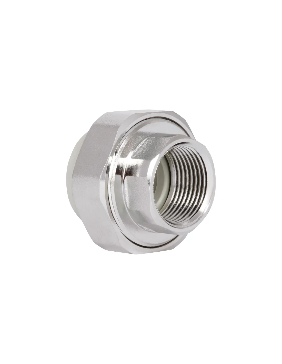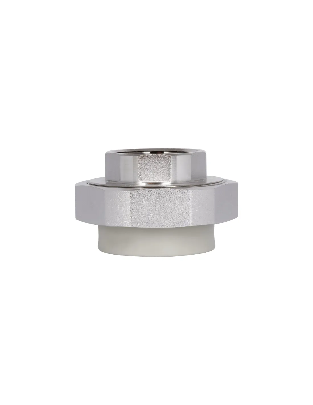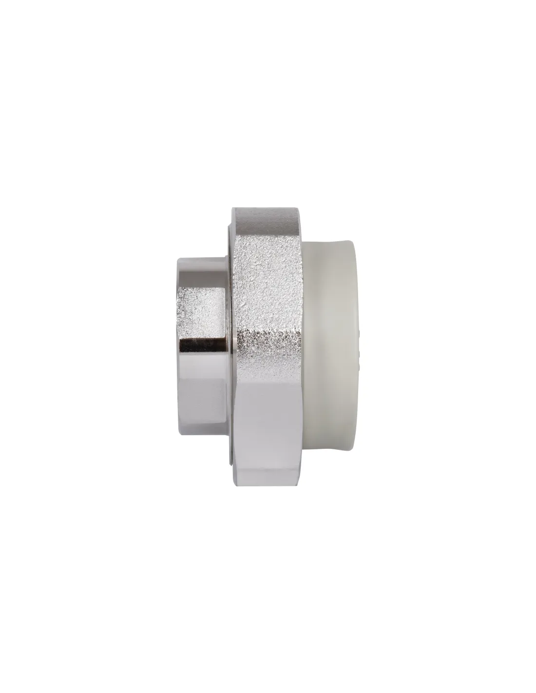 Фитинг состоит из корпуса PPR, латунного резьбового элемента и накидной гайки. Латунная вставка обеспечивает прочность резьбы и устойчивость к коррозии, а PPR-корпус гарантирует герметичность при сварке с трубой. Американка подходит для эксплуатации в системах ГВС, ХВС и отопления с максимальным рабочим давлением 20 бар.