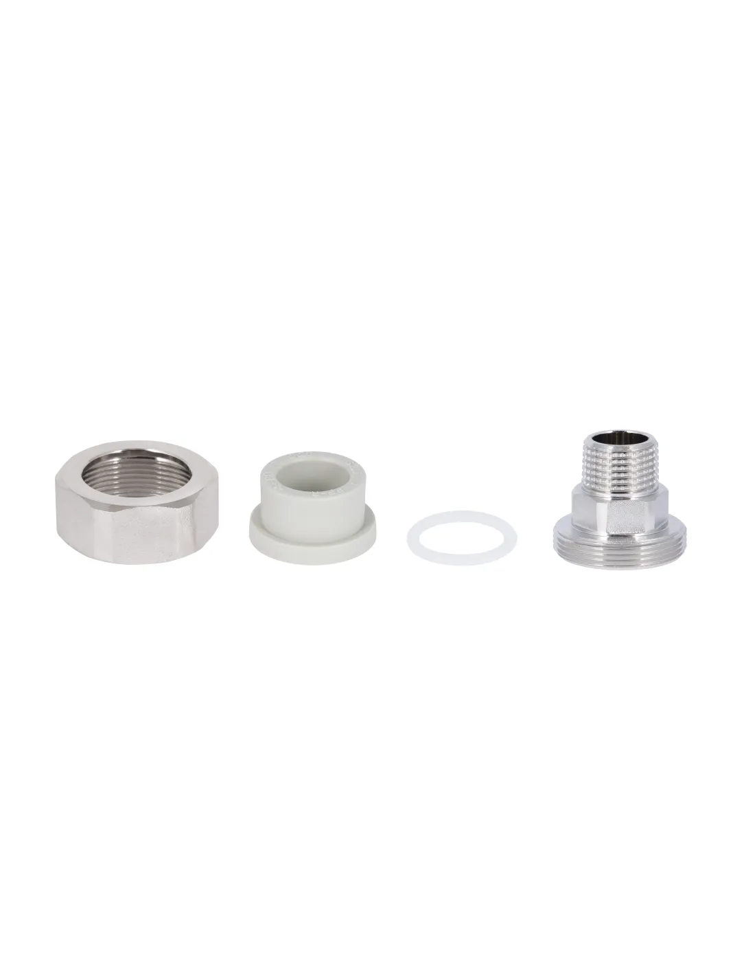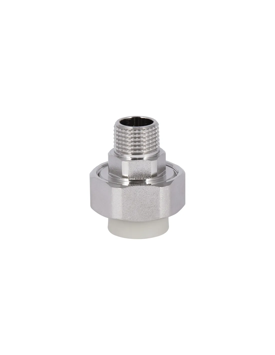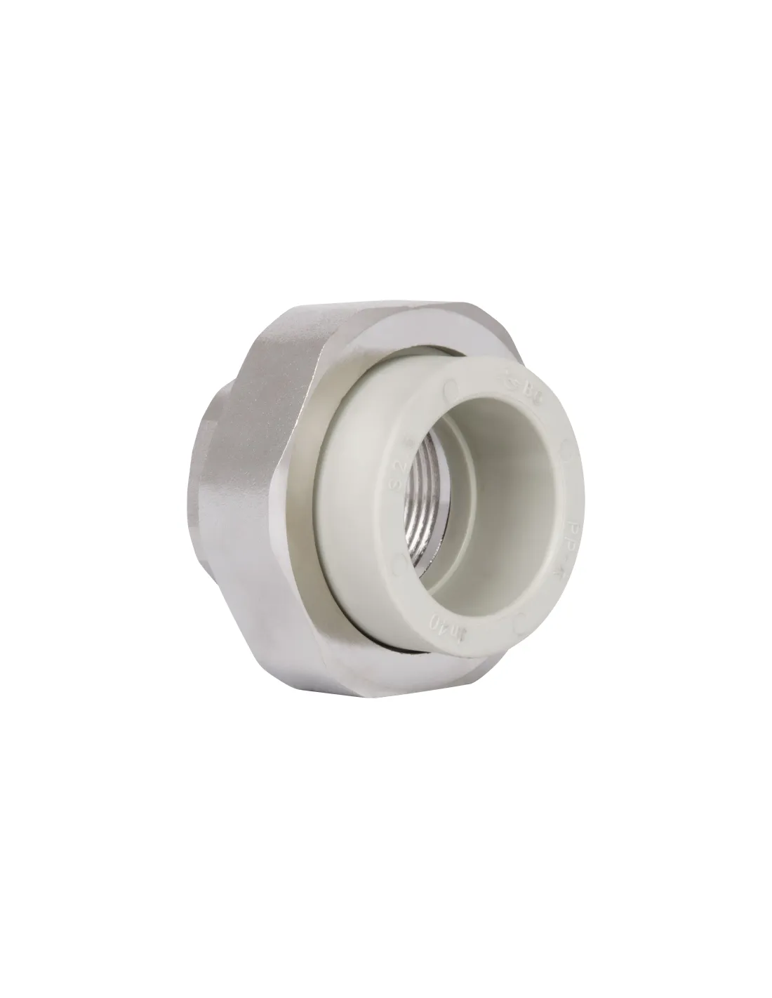 Фитинг выполнен из высокопрочного PPR и оснащен латунным резьбовым элементом с накидной гайкой, что обеспечивает долговечность и устойчивость к давлению PN20. Латунь, контактирующая с резьбой, гарантирует герметичность и коррозионную стойкость в зоне разборного соединения. Соединение с PPR трубой производится термической сваркой.
