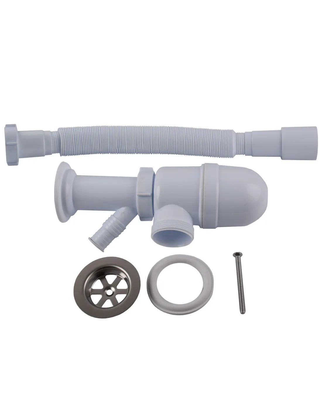 Сифон для умывальника и мойки Optimum OPTI-13043 1 1/2 дюйма х 40 с отводом для стиральной машины и гофротрубой 40х40/50 – функциональный фитинг для экономии пространства в ванной или кухне. Позволяет объединить слив сантехнического прибора и бытовой техники в один узел.
