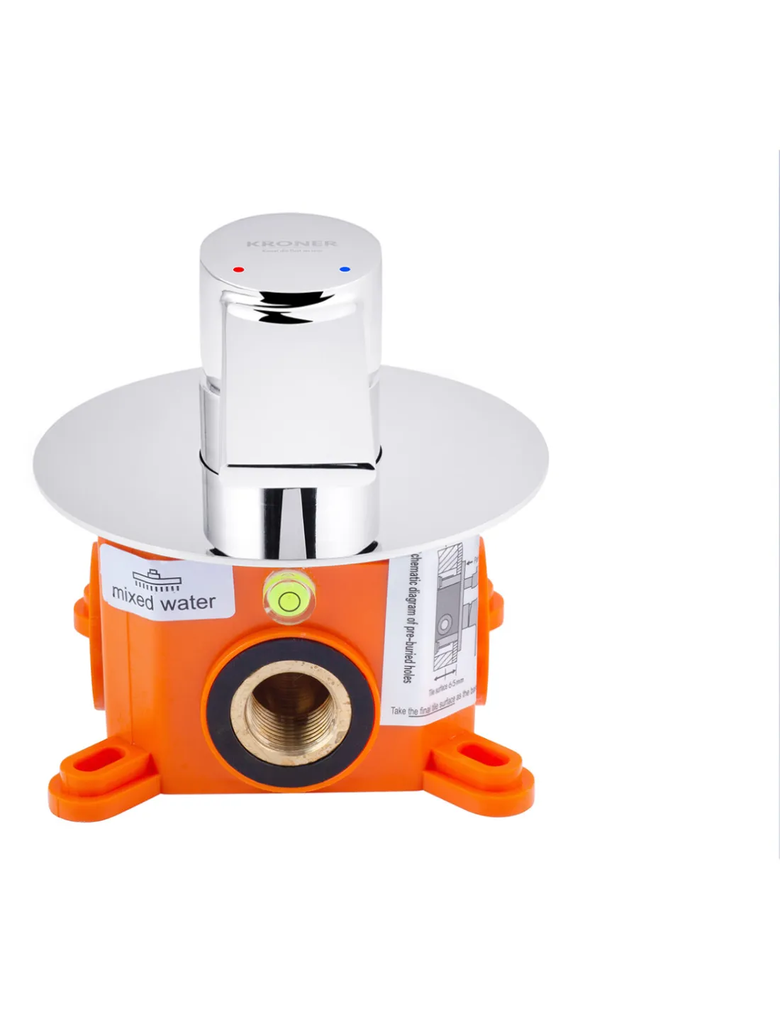 Смеситель для душа Kroner KRP Basis - C080 скрытого монтажа современное сантехническое решение, при котором подводы для воды и основные крепежные элементы встраиваются в стену, а снаружи остаются только элементы управления и подачи воды, такие как: рукоятка. Смеситель изготовлен из латуни, а его компоненты из надежных прочных материалов. Требует профессионального монтажа и планирования на этапе ремонта, т.к. основные элементы подвода воды будут вмонтированы в стену без доступа для ремонта. Тип управления смесителем - однорычажный, поворот рычага используется для регулировки температуры подачи воды. Смеситель и его компоненты покрыты качественным хромом, который не стирается в процессе эксплуатации. Тип подключения - жесткий подвод, скрытый монтаж. Диаметр подвода воды - 1/2 дюйма. Гарантия на изделие 60 месяцев. Страна производитель - Германия.