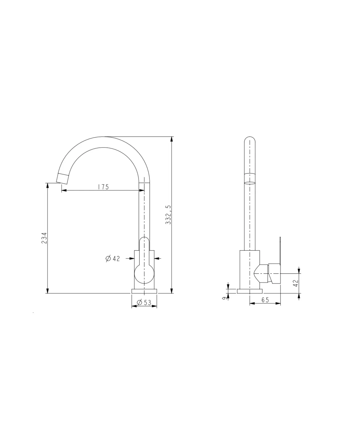 - Высота всего смесителя: 332 мм,