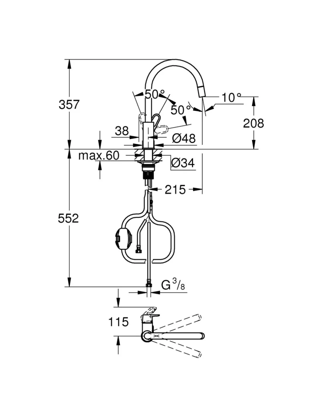 Тип кухонного смесителя — однорычажный, с С-образным изливом. Высота излива — 208 мм, длина — 215 мм. Излив поворачивается на 360 градусов, что позволяет использовать смеситель для моек с несколькими чашами. Рабочее давление — 1 бар. Конструкция и качество сборки соответствуют высоким немецким стандартам.