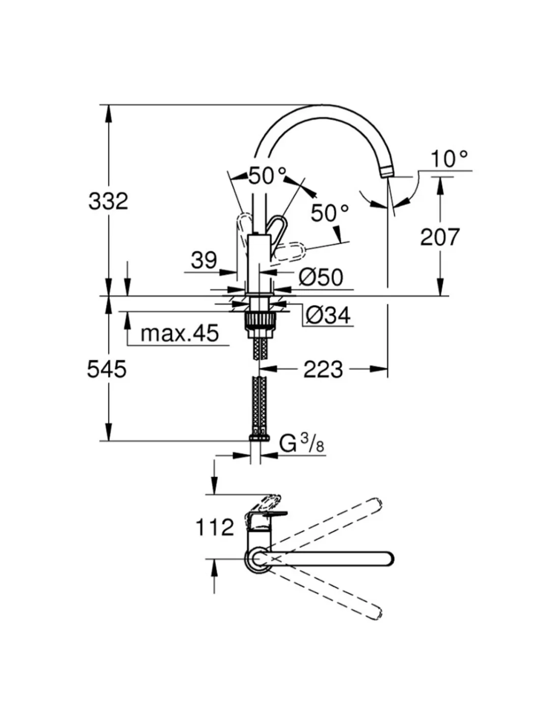 Тип кухонного смесителя — однорычажный, с U-образным изливом. Высота излива — 207 мм, длина — 223 мм. Излив вращается на 360°, обеспечивая максимальную свободу движения во время работы на кухне.
