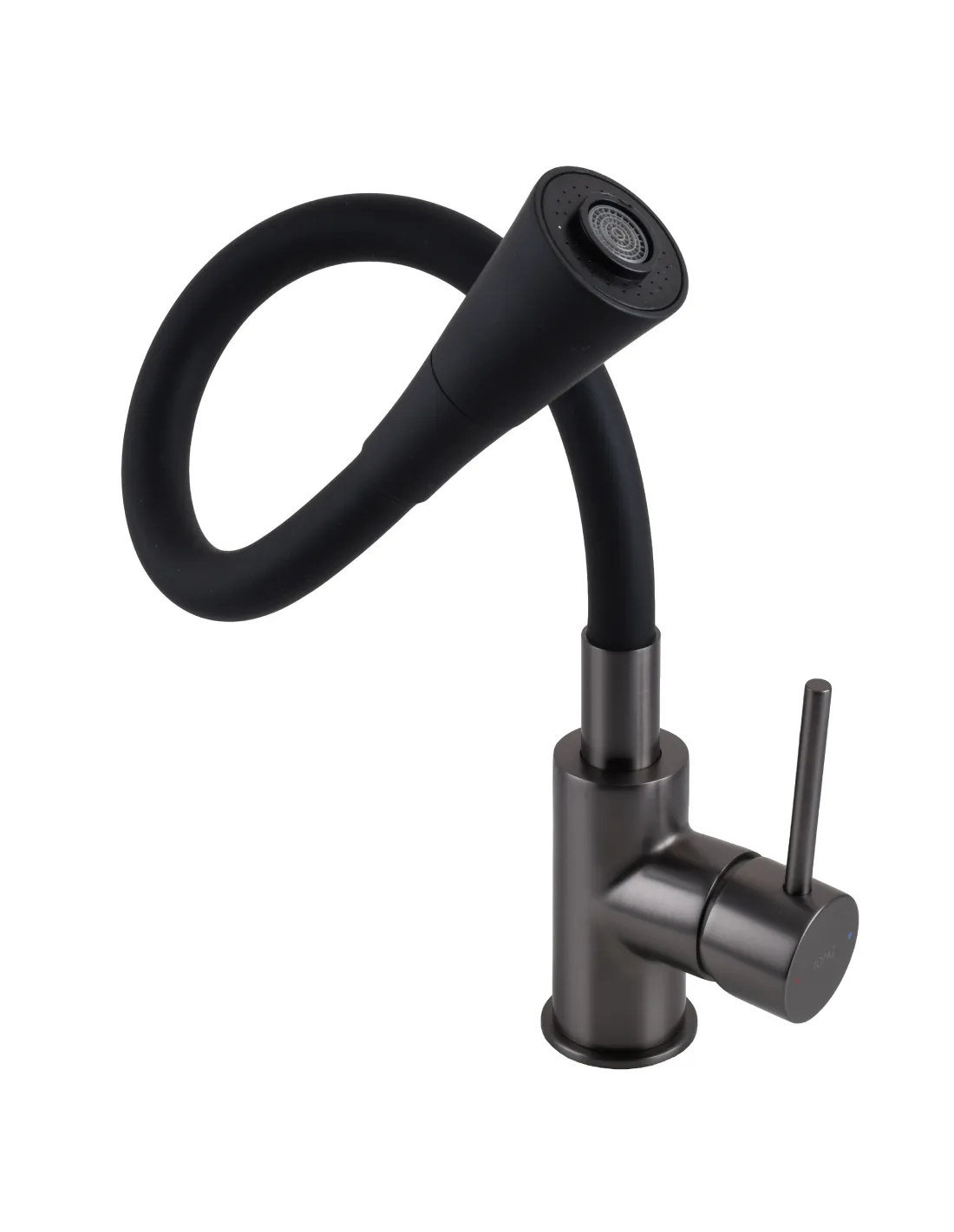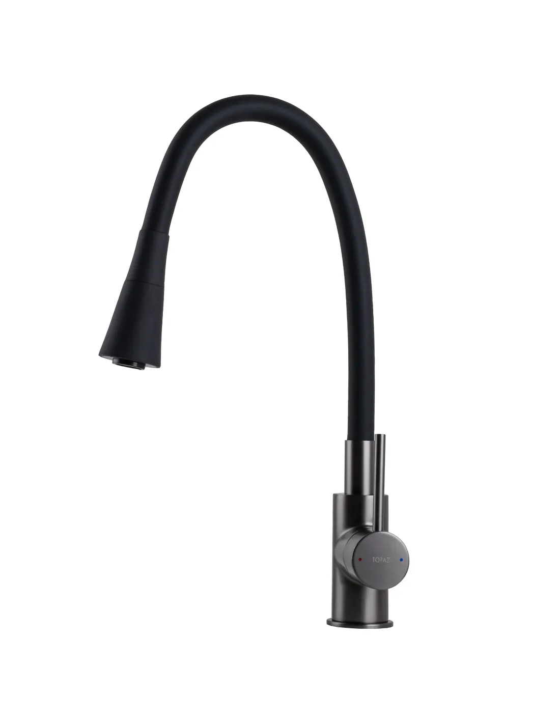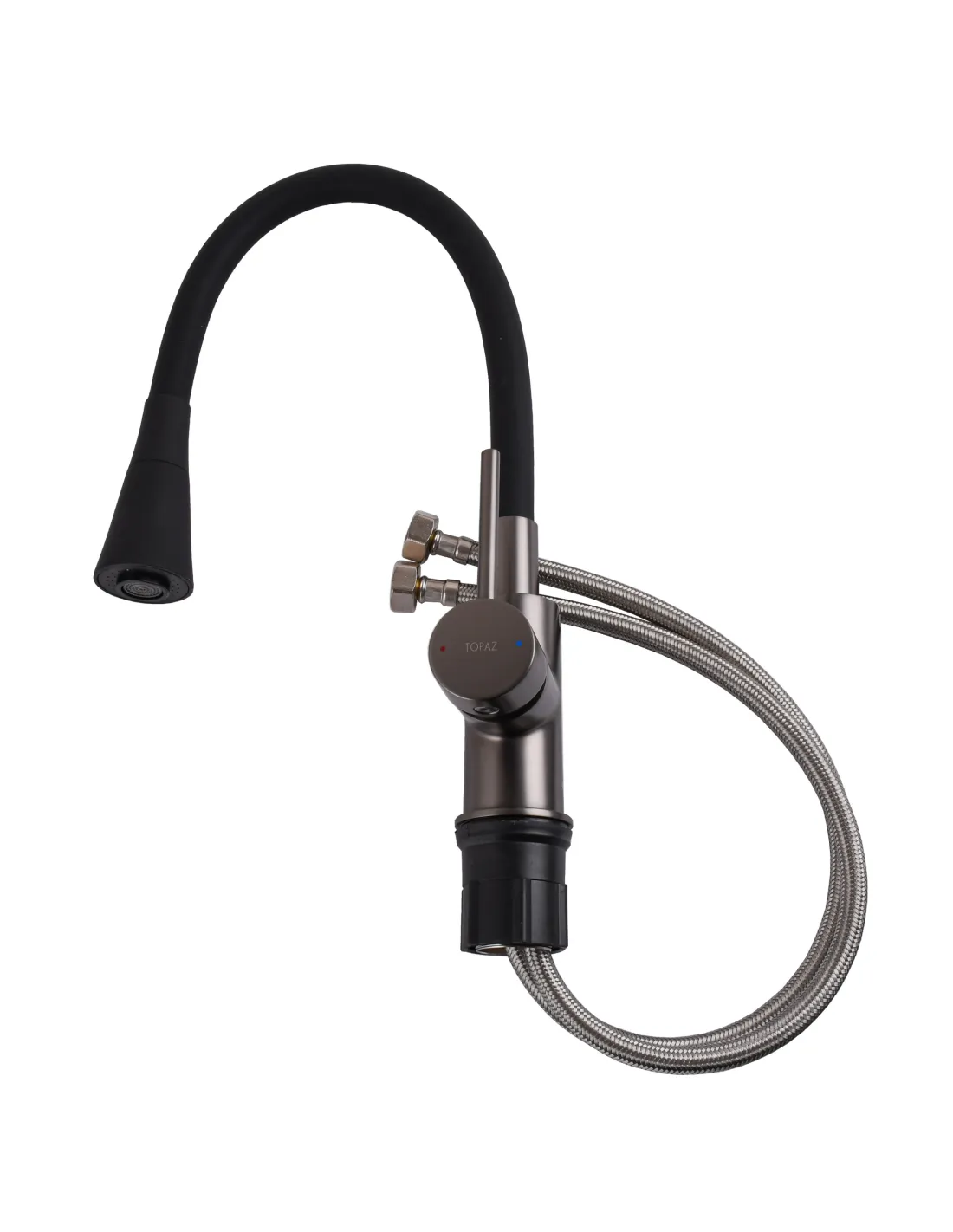 Смеситель для кухни с гибким изливом Topaz LOFT TLF 8854-H39-GP-B01 гармонично впишется в интерьер каждой кухни. Предназначен для подвода на кран горячей и холодной воды, смешивания её и подачу с нужным напором пользователю. Конструктивная особенность смесителя - черный гофроизлив и душевая насадка, что повышает его функционал при использовании. Подключение для питьевой воды обеспечивает удобный доступ к чистой воде, не требуя дополнительного крана. Смеситель выполнен по всем технологиям и стандартам из латуни. Механизм смешивания - картридж, диаметром 35 мм. Картридж из высококачественного материала обеспечит долговечность службы благодаря высокому ресурсу пластин. Даже если в водопроводной системе резко повысится давление, картридж выдержит нагрузку. При переключении и плавном регулировании силы напора воды не создает лишнего шума.