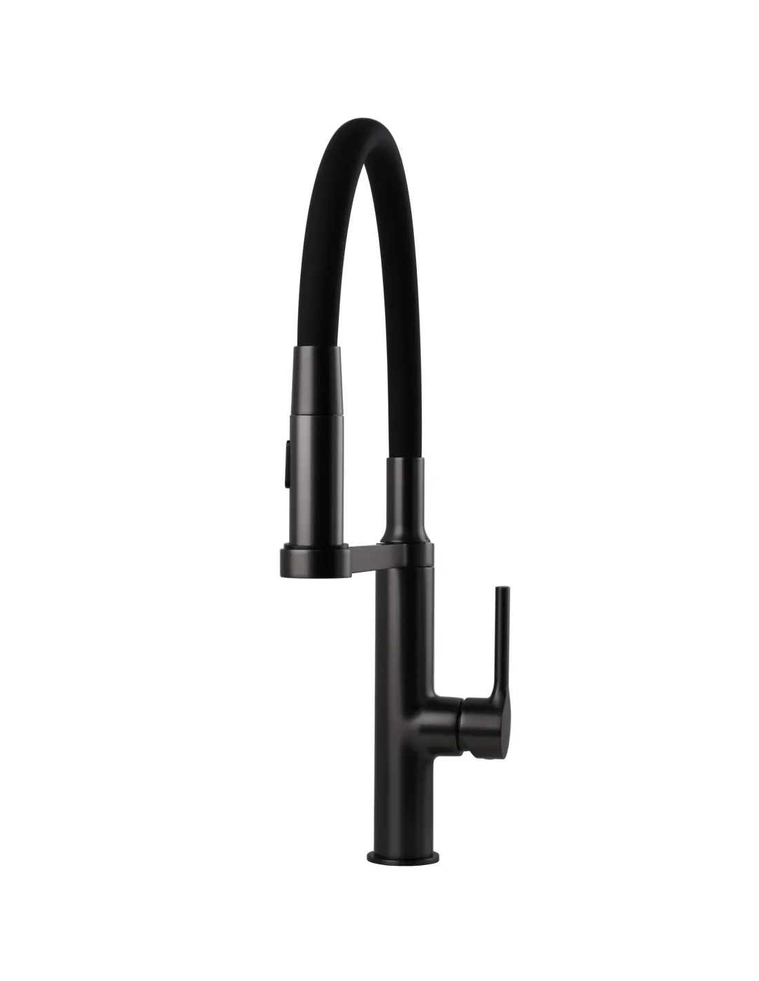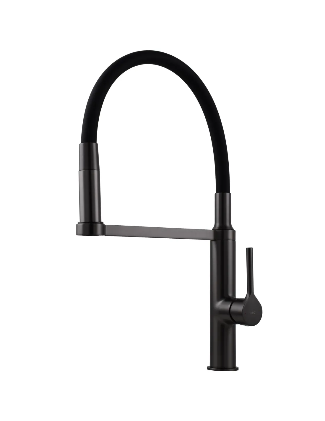 Тип кухонного смесителя – однорычажный, оснащен поворотным гибким изливом черного цвета, благодаря чему повышается функциональность и удобство использования крана. Рабочее давление до 3 Бар, расход воды до 13 л/мин. Излив гнется под удобным углом, что позволяет его использовать для кухонных моек с двумя или тремя чашами.