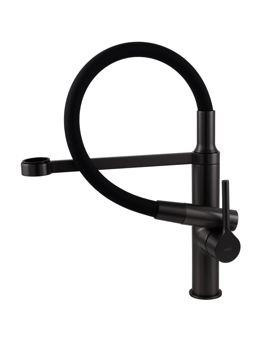 Смеситель для кухни с гибким изливом Topaz Sardinia TS 08401-H71-GP гармонично впишется в интерьер каждой кухни. Предназначен для подвода на кран горячей и холодной воды, смешивания её и подачу с нужным напором пользователю. Конструктивная особенность смесителя - черный гофроизлив, что повышает его функционал при использовании. Подключение для питьевой воды обеспечивает удобный доступ к чистой воде, не требуя дополнительного крана. Смеситель выполнен по всем технологиям и стандартам из латуни. Механизм смешивания - картридж, диаметром 35 мм. Картридж из высококачественного материала обеспечит долговечность службы благодаря высокому ресурсу пластин. Даже если в водопроводной системе резко повысится давление, картридж выдержит нагрузку. При переключении и плавном регулировании силы напора воды не создает лишнего шума.