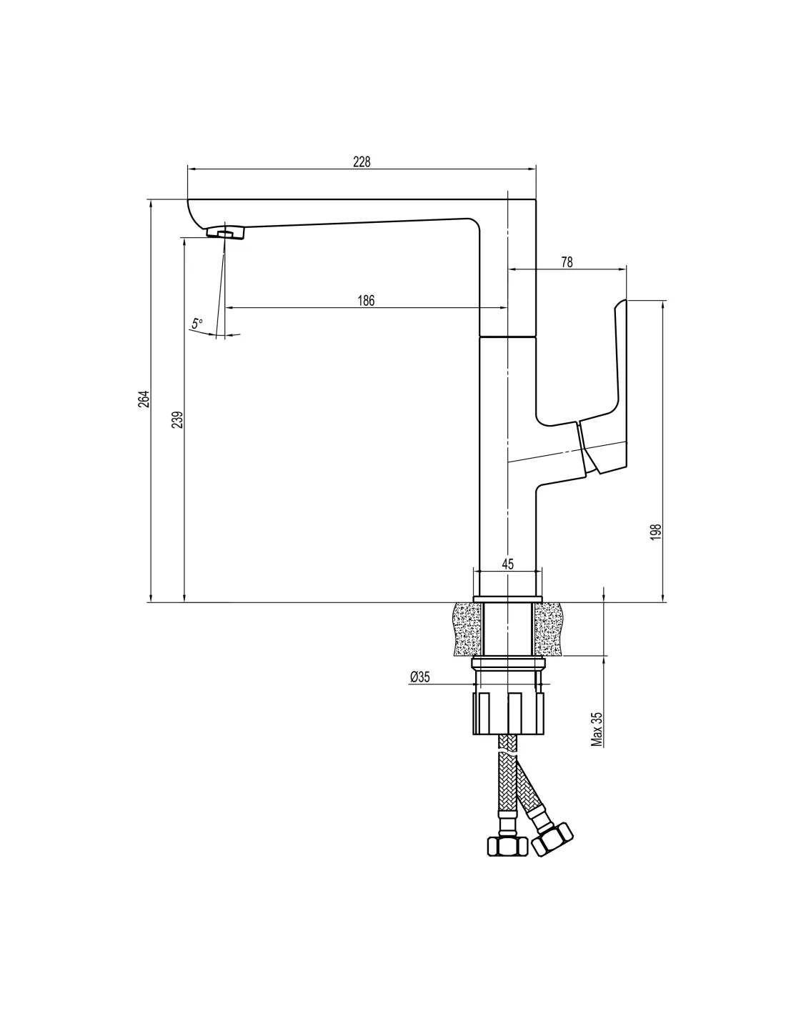 Тип кухонного смесителя – однорычажный, оснащен поворотным изливом, длина излива - 18 см, высота излива 23 см. Рабочее давление до 3 Бар, расход воды до 13 л/мин. Излив вращается на 360 градусов, что позволяет его использовать для кухонных моек с двумя или тремя чашами.
