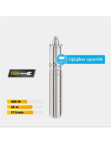 Шнековый насос для скважин Tekk Haus 3QGD 1,9/6 0.6 кВт предназначен для подъема воды из скважины или колодца с высотой всасывания больше 8 метров и диаметров от 76 мм. Используется данный насос для обеспечения водой дома, дачи, квартиры, а также для полива небольших земельных участков. Мощность двигателя 0,6 кВт. Материал изделия насоса - нержавеющая сталь, рабочее колесо является шнеком. Максимальная производительность насоса 32 литра в минуту. Максимальный напор воды достигает 60 метров / 6 bar. Диаметр насоса - 3 дюйма (76 мм). Диаметр подключения скважинного насоса 1 дюйм. Длина кабеля - 15 метров. Максимальная температура жидкости: 35 градусов по Цельсию. Вес насоса – 8,3 кг. Гарантия 2 года. Страна производитель - Китай.
