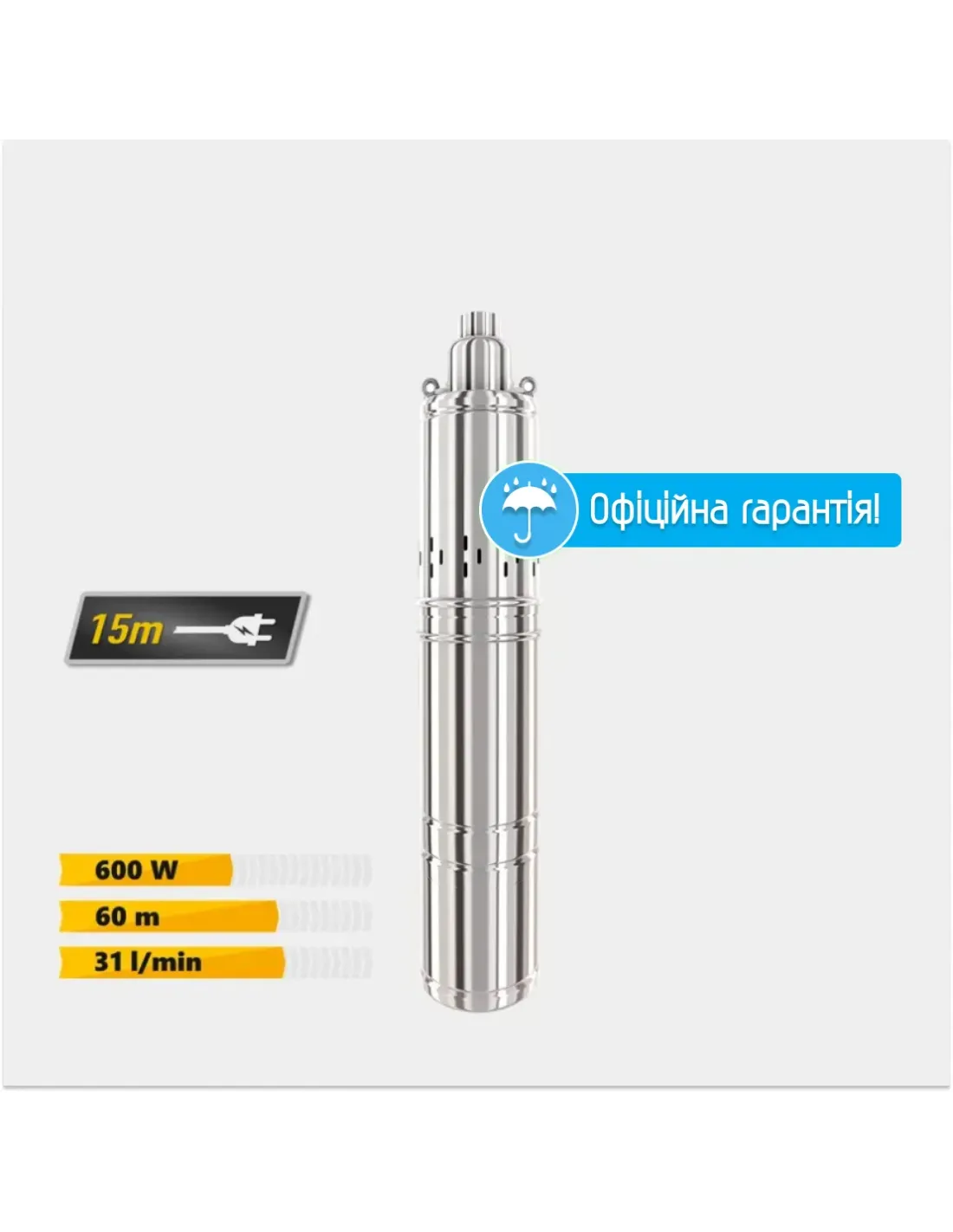 - Напор достигает 60 метров / 6 bar,
