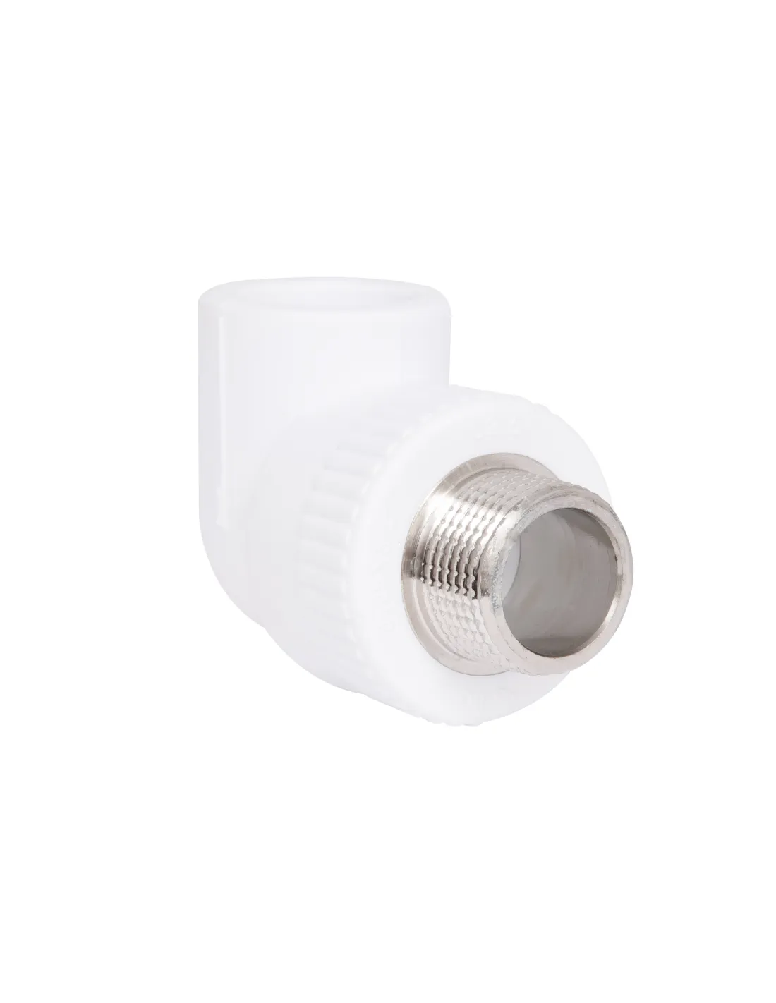 Уголок НР 90° Blue Ocean 25х3/4 белого цвета предназначен для неразъемного поворота полипропиленовой трубы диаметром 25 мм на 90 градусов с одновременным переходом на наружную латунную резьбу 3/4 дюйма. Этот комбинированный фитинг используется для подключения к компонентам инженерной системы, имеющим внутреннюю резьбу, обеспечивая прочный угловой переход с PPR на металл, с сохранением эстетики белого цвета.