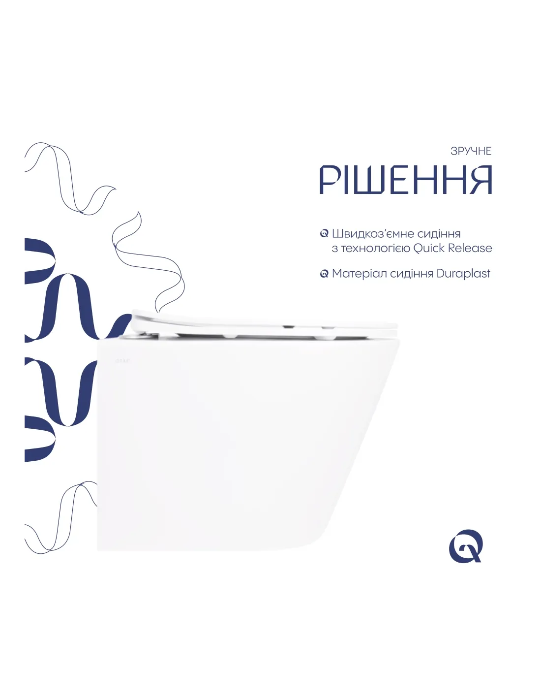 Унитаз безободковый подвесной Q-Tap Swan оснащен сиденьем с функцией Soft-close, которая позволяет избежать постоянных ударений и неприятного стука во время закрытия. Такая технология осуществляет плавное опускание крышки, медленное и бесшумное, что повышает уровень комфорта и простоту эксплуатации.