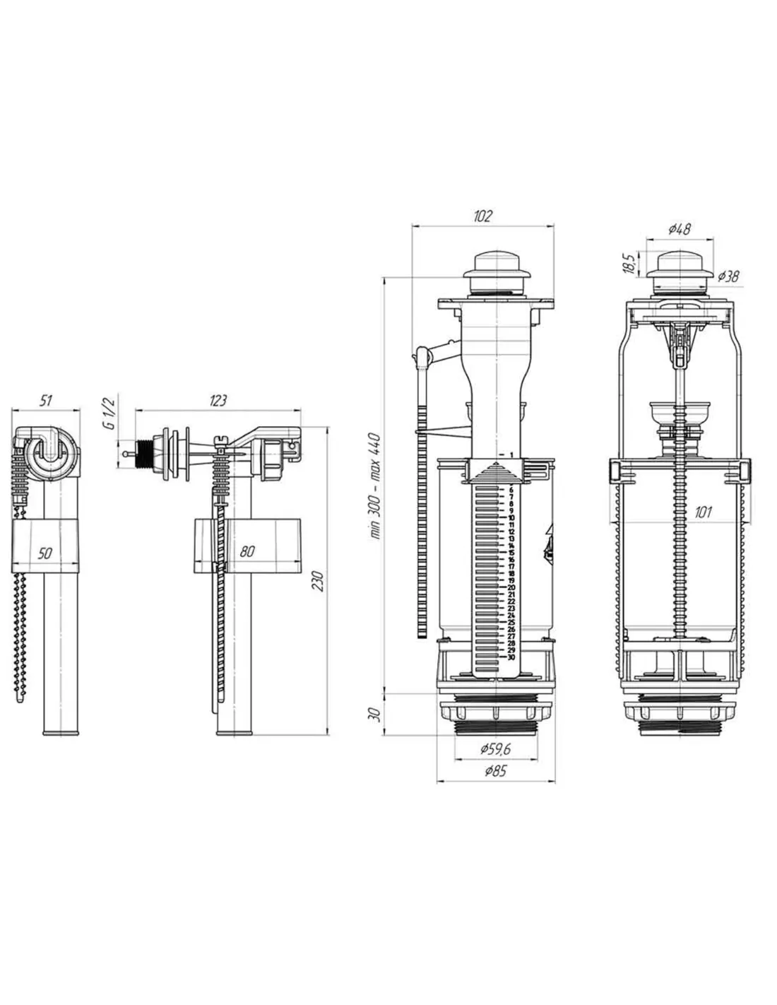 Запорная арматура на унитаз Optimum OPTI 1010 имеет долгий срок эксплуатации и обеспечивает бесшумное и быстрое наполнение бачка водой. Наполнительный механизм имеет возможность регулировки уровня заполнения.