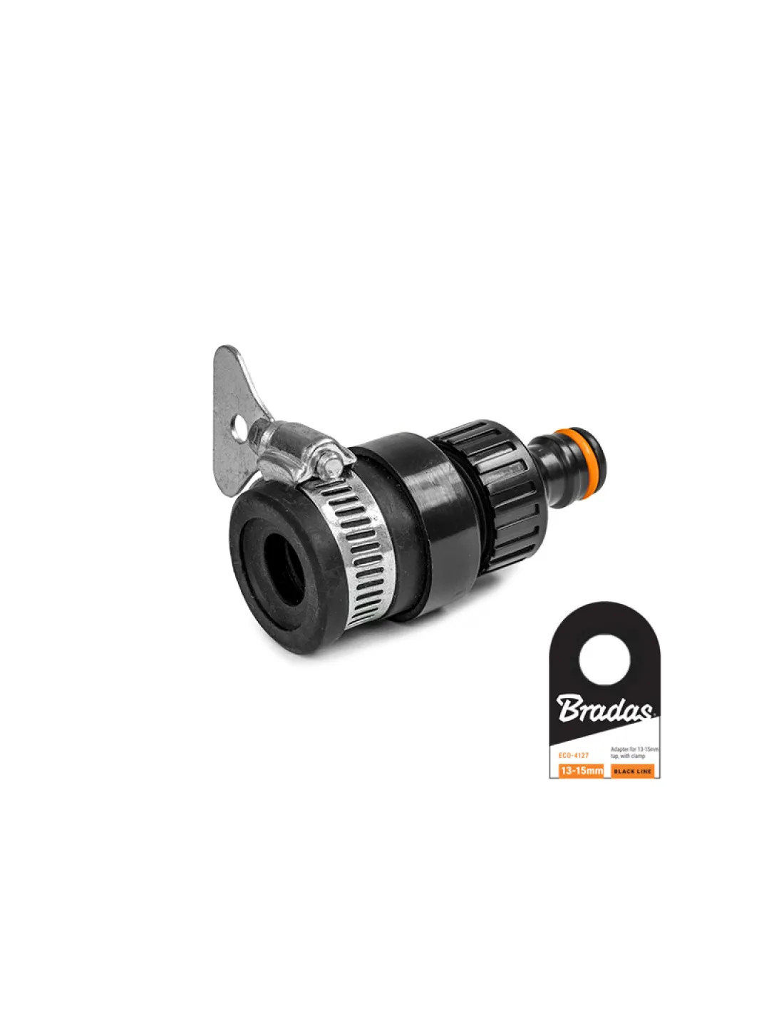 Адаптер для конектора Bradas Black Line ECO-2102 із затискачем - призначений для швидкого та зручного підключення поливального обладнання (шлангів, з`єднувачів, розпилювачів) до системи водопостачання через кран без різьблення. Адаптер легко встановлюється на кран діаметром 13-15 мм та забезпечує надійне з`єднання. Оснащений регульованим металевим хомутом, який дозволяє щільно зафіксувати адаптер та запобігти протіканню під час використання.