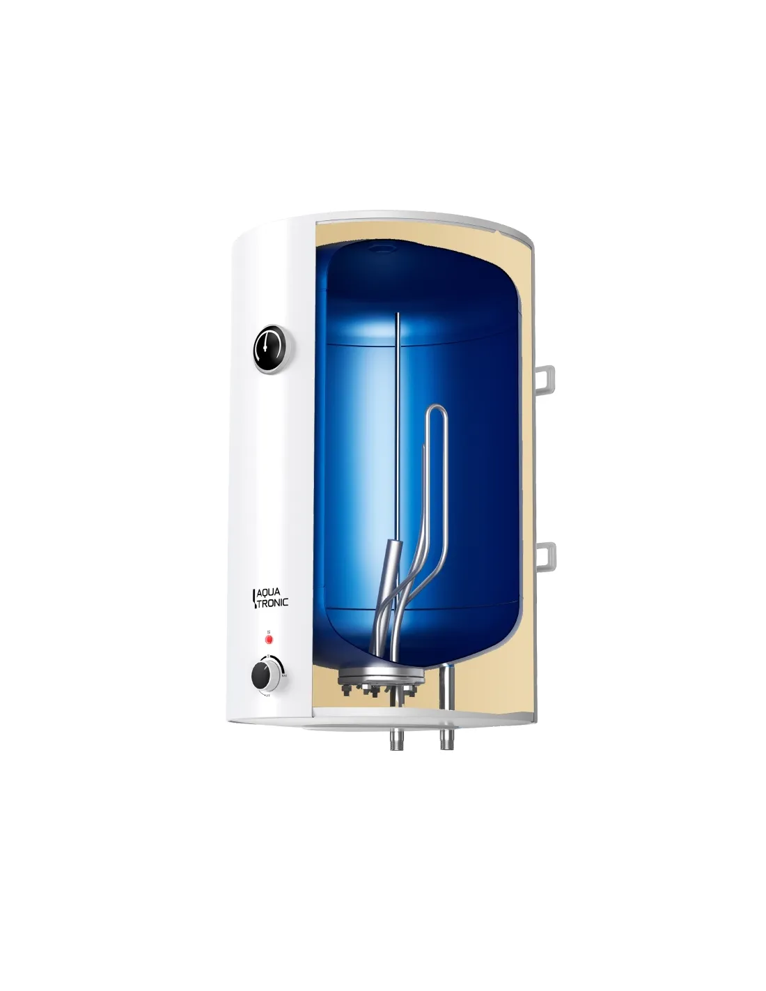 Бойлер Aquatronic Round W1004615 B4 - електричний накопичувальний бойлер настінного монтажу з мокрим ТЕНом. Вид Тена - мокрий, знаходиться у безпосередньому контакті з водою і має температуру, близьку до температури води. Внутрішній бак виготовлений із листової сталі товщиною 2 мм, із застосуванням удосконаленої технології трирівневого захисту від корозії - застосування такої технології захисту у кілька разів збільшує термін служби бака: