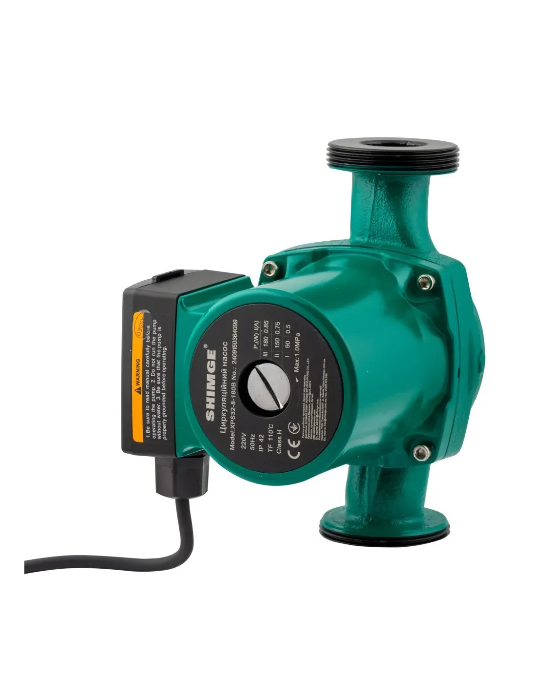 Циркуляційний насос Shimge XPS 32-8-180B, з гайками призначений для примусової циркуляції теплоносія в системах опалення, охолодження та системах дюйм тепла підлога дюйм. Забезпечує ефективне перенесення тепла у приватних будинках та комерційних приміщеннях. Корпус насоса виконаний із чавуну. Укомплектований сполучними гайками та кабелем зі штепсельною вилкою для зручного підключення. Максимальний тиск: 7.5 метрів. Максимальна продуктивність – 6 куб.м/год. Монтажна довжина – 180 мм. Три режими швидкості роботи. Гарантія 24 місяці. Країна виробник - Китай.