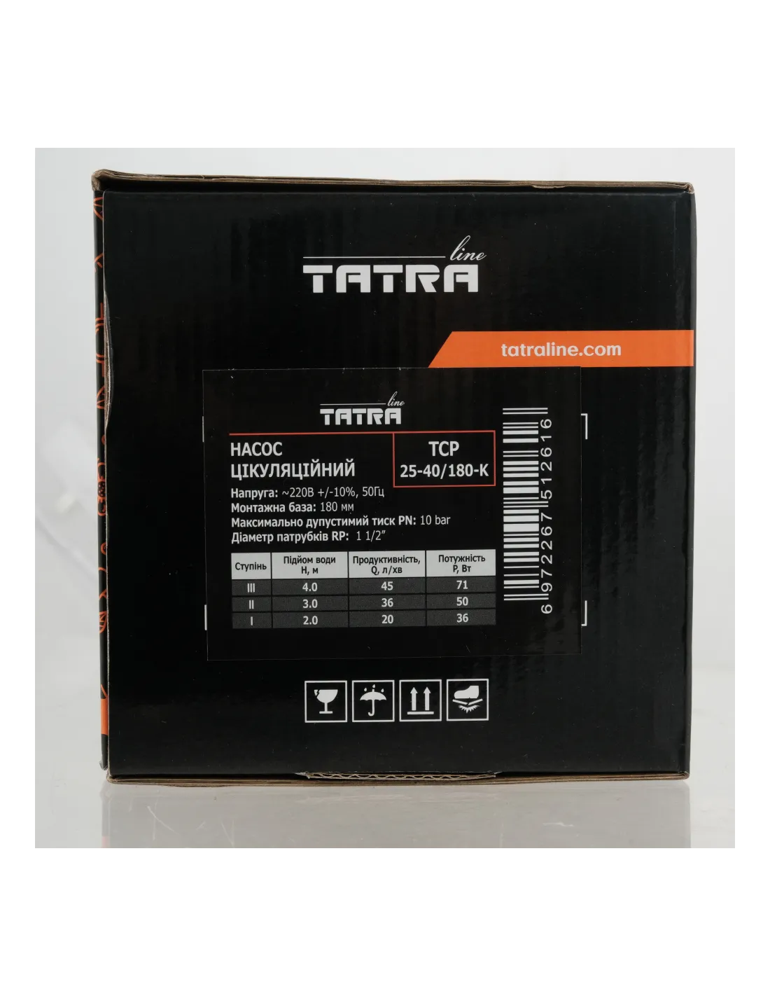 Циркуляційний насос Tatra-Line TCP 25-40/180 180 мм міжосьова монтажна відстань з різьбовим з`єднанням ЗЗ 1 1/2 дюйма. Призначений для подачі та перекачування робочої рідини в побутових системах опалення закритого та відкритого типу, у системах водяної теплої підлоги, системах кондиціонування, а також в інших установках зі стабільним або практично незмінним обсягом робочої рідини при мінімальному споживанні електроенергії.