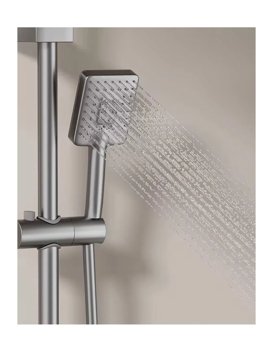У душовій системі Armata BCF-009-J Graphite всі функціональні елементи видимі, а комунікації приховані за стіною. Гаряча та холодна вода підключаються за допомогою жорстких підводів. Змішування води здійснюється картриджем. Перемикання режимів роботи здійснюється кнопковим перемикачем. Потік води можна направити на верхній душ або лійку. Кут нахилу верхнього душу регулюється, а положення ручної лійки щодо підлоги фіксується за допомогою утримувача. Система підтримує 3 режими роботи для ручної лійки, що дозволяє вибрати оптимальний потік води під ваші уподобання.
