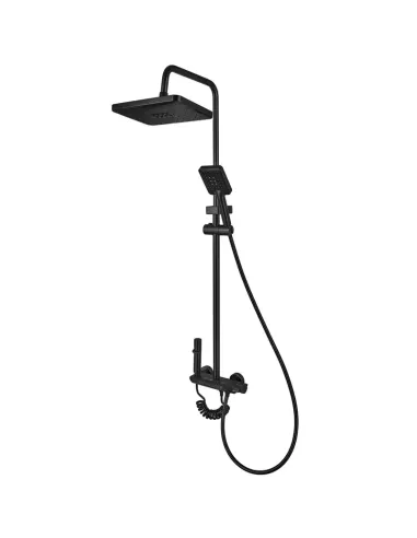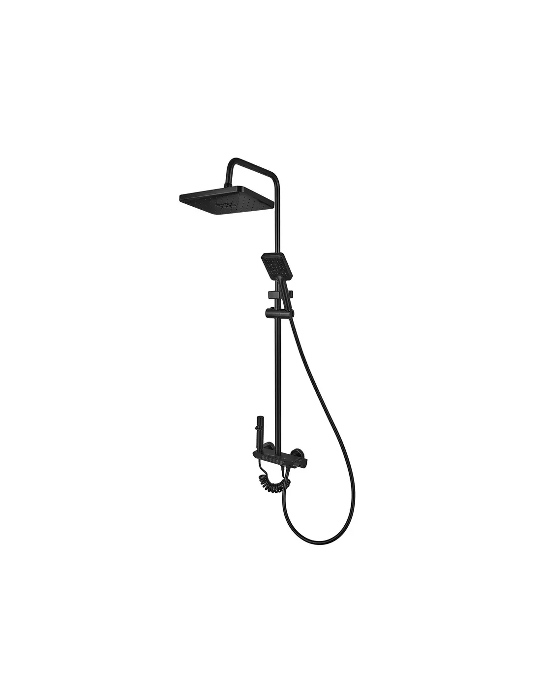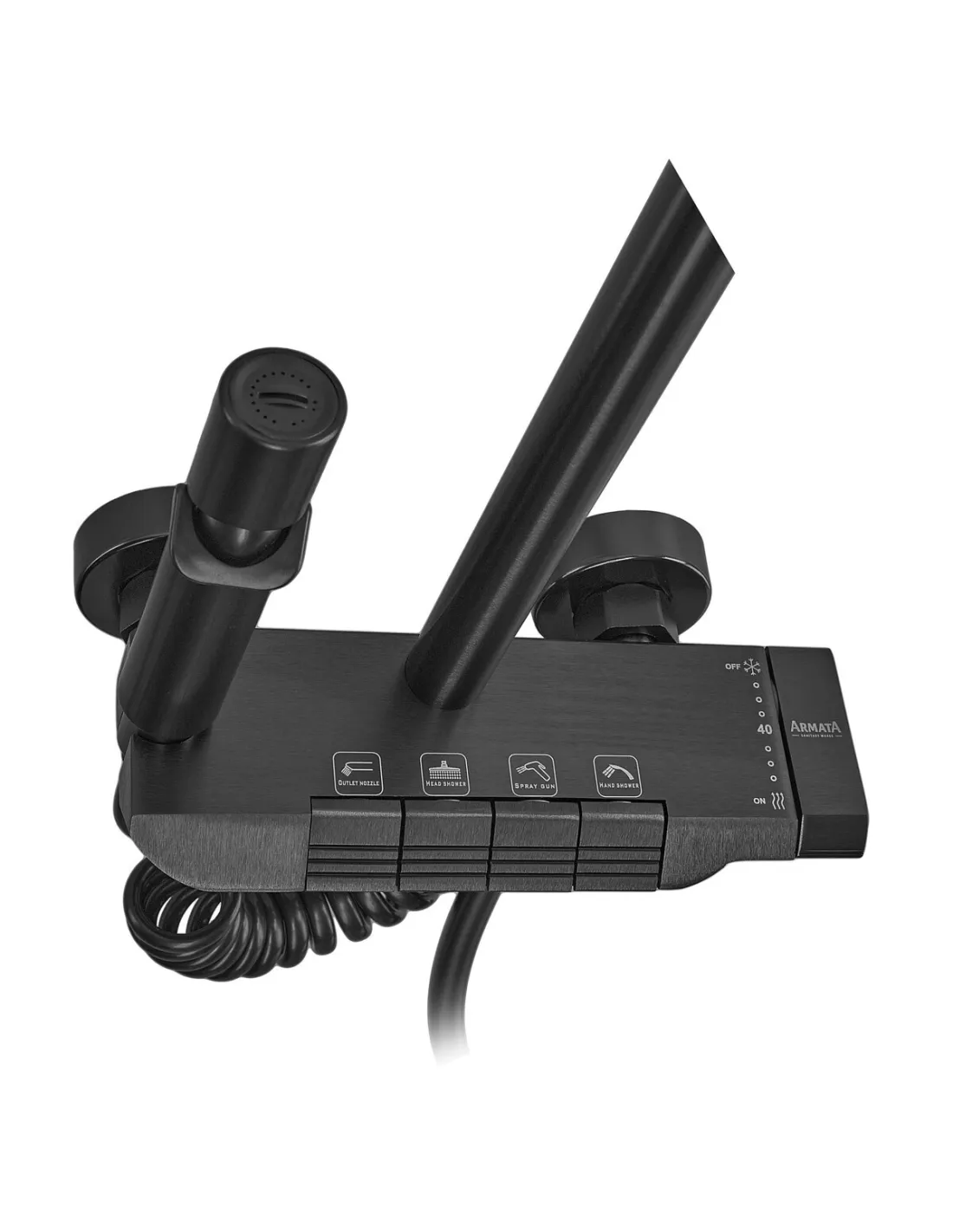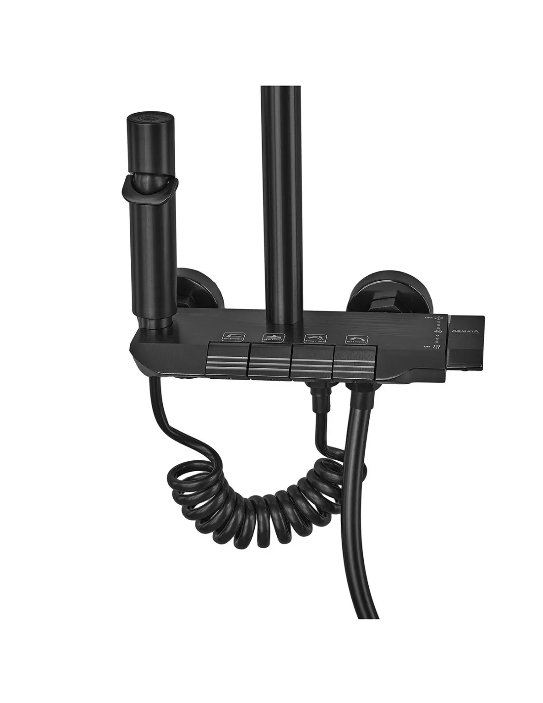 В душевой системе Armata BCS-009-J Black все функциональные элементы видимы, а коммуникации скрыты за стеной. Горячая и холодная вода подключаются с помощью жестких подводов. Смешивание воды осуществляется картриджем. Переключение режимов работы производится кнопочным переключателем. Поток воды можно направить на верхний душ или ручную лейку. Угол наклона верхнего душа регулируется, а положение ручной лейки относительно пола фиксируется при помощи держателя. Система поддерживает 4 режима работы для ручной лейки, что позволяет выбрать оптимальный поток воды под ваши предпочтения.
