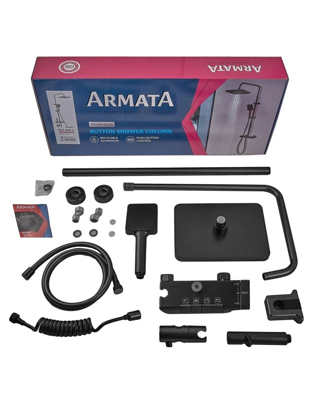 Душевая система Armata BCS-009-J Black с кнопочным переключателем и 4 режимами оснащена верхним душем и гибкой ручной лейкой, что обеспечивает удобство и функциональность при использовании в ванной комнате. Душевую систему можно установить на стену – настенный монтаж. Изготовлена из алюминия с черным матовым покрытием, долговечна и надежна в эксплуатации. Все крепления выполнены со стандартным резьбовым соединением 1/2 дюйма.