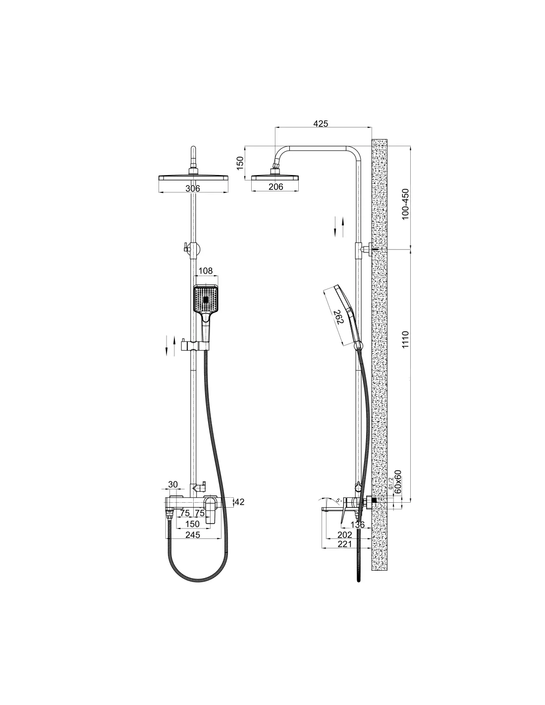- Душевая стойка – длина 148 см;