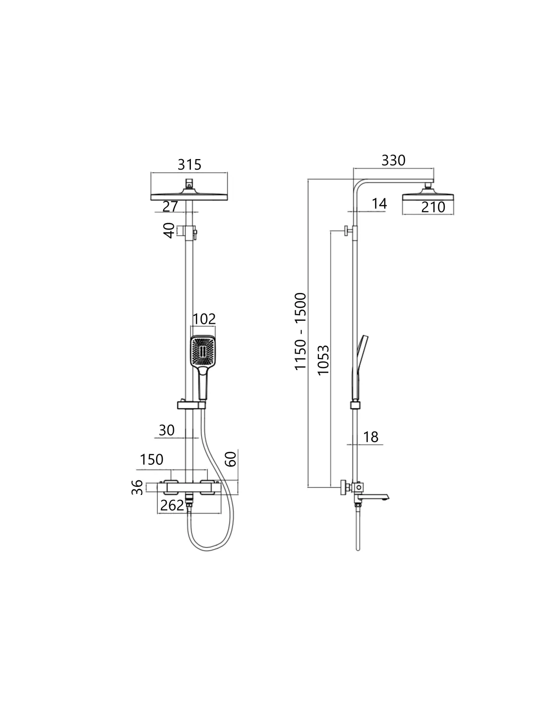 - Верхній душ - прямокутна лійка, розміром 315х210 мм;