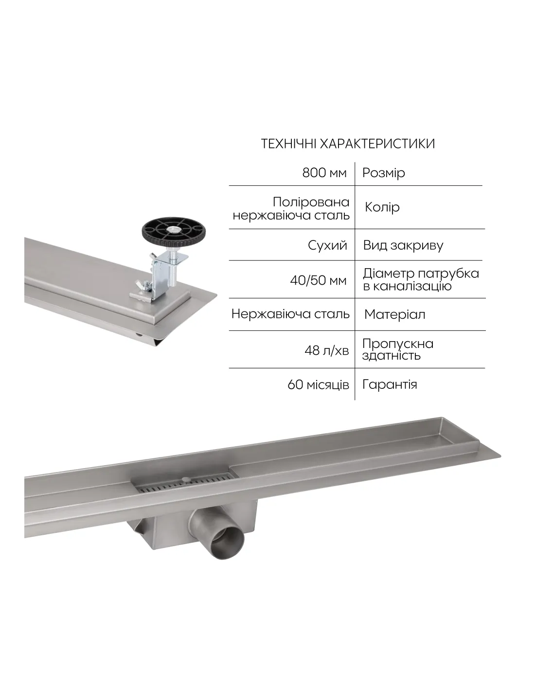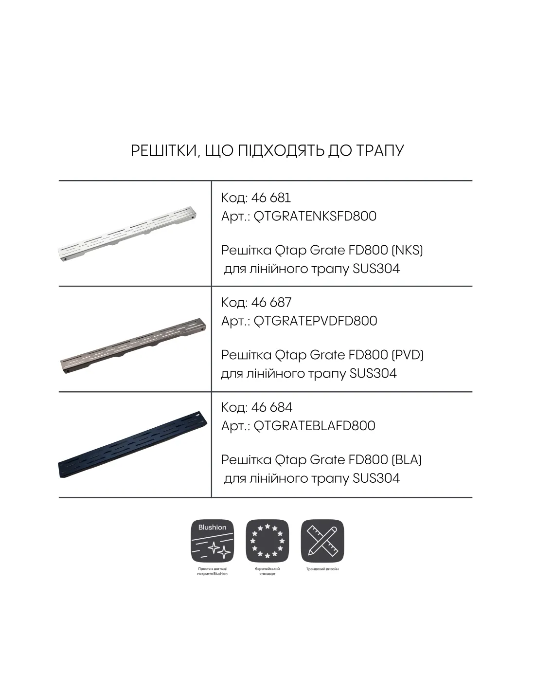 Каналізаційний лінійний трап Q-Тap Taurus призначений для ефективного відведення використаної води з душової кабіни в каналізацію. Монтується у підлогу. Виключає потребу використання душового піддону. Корпус трапу виконаний із якісної нержавіючої сталі. Без ґрат. При необхідності накладка перетворюється на лоток під укладання керамічної плитки. Затвор сухий. Довжина – 800 мм. Висота трапу регулюється в діапазоні від 90 до 150 мм. Гарантія: 5 років. Країна-виробник – Чехія.