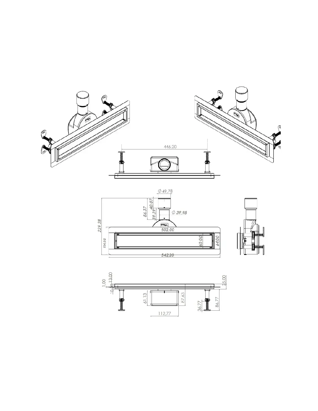 Трап лінійний душовий Tillo TM256-C-50 забезпечує ефективне відведення використаної води з душової кабіни в каналізацію. Монтується у підлогу. Матеріал – нержавіюча сталь. Затвор поворотний сухий. Довжина трапу – 540 мм. Матеріал сифону – пластик. Ґрати – нержавіюча сталь 500х64 мм. Висота трапу регулюється в діапазоні від 50 до 86 мм. Колір – сталевий. Гарантія на виріб 12 місяців. Країна-виробник – Туреччина.